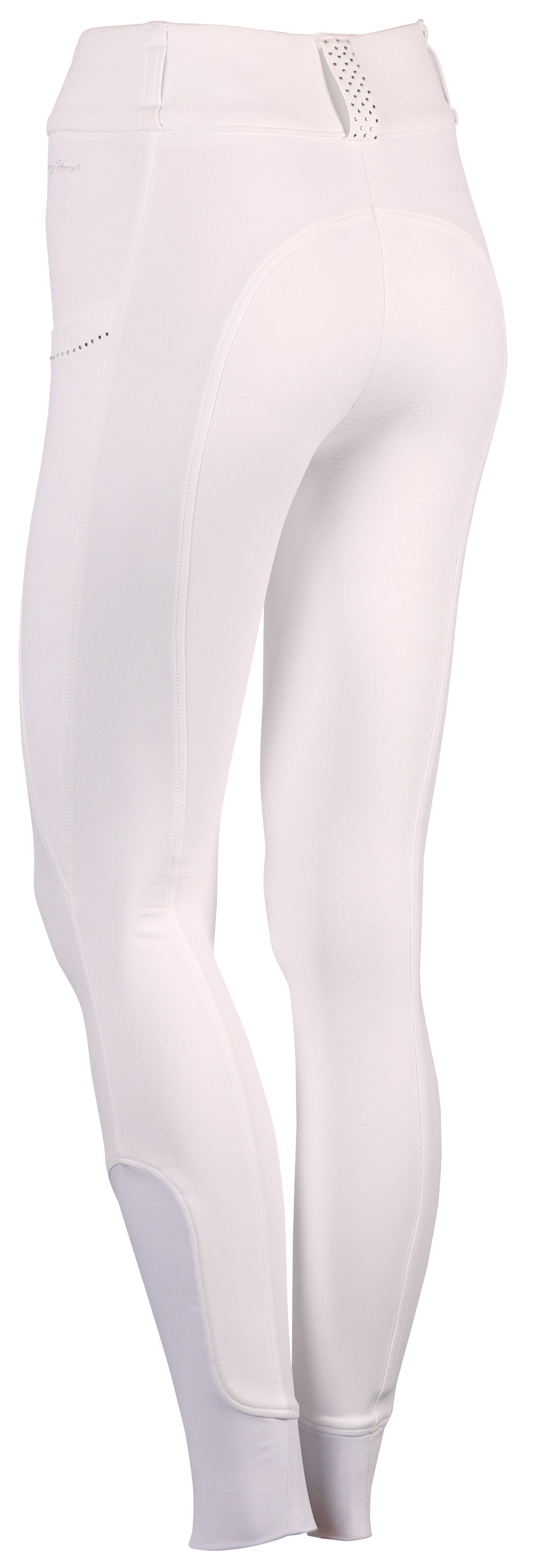Legging d'équitation doté d'une taille haute avec passants, d'une large ceinture à l'arrière décorée de cristaux, de deux poches latérales avec cristaux, d'un siège roulé avec un imprimé en silicone pour une meilleure adhérence en selle et d'un insert élastiqué autour des chevilles pour plus de confort.