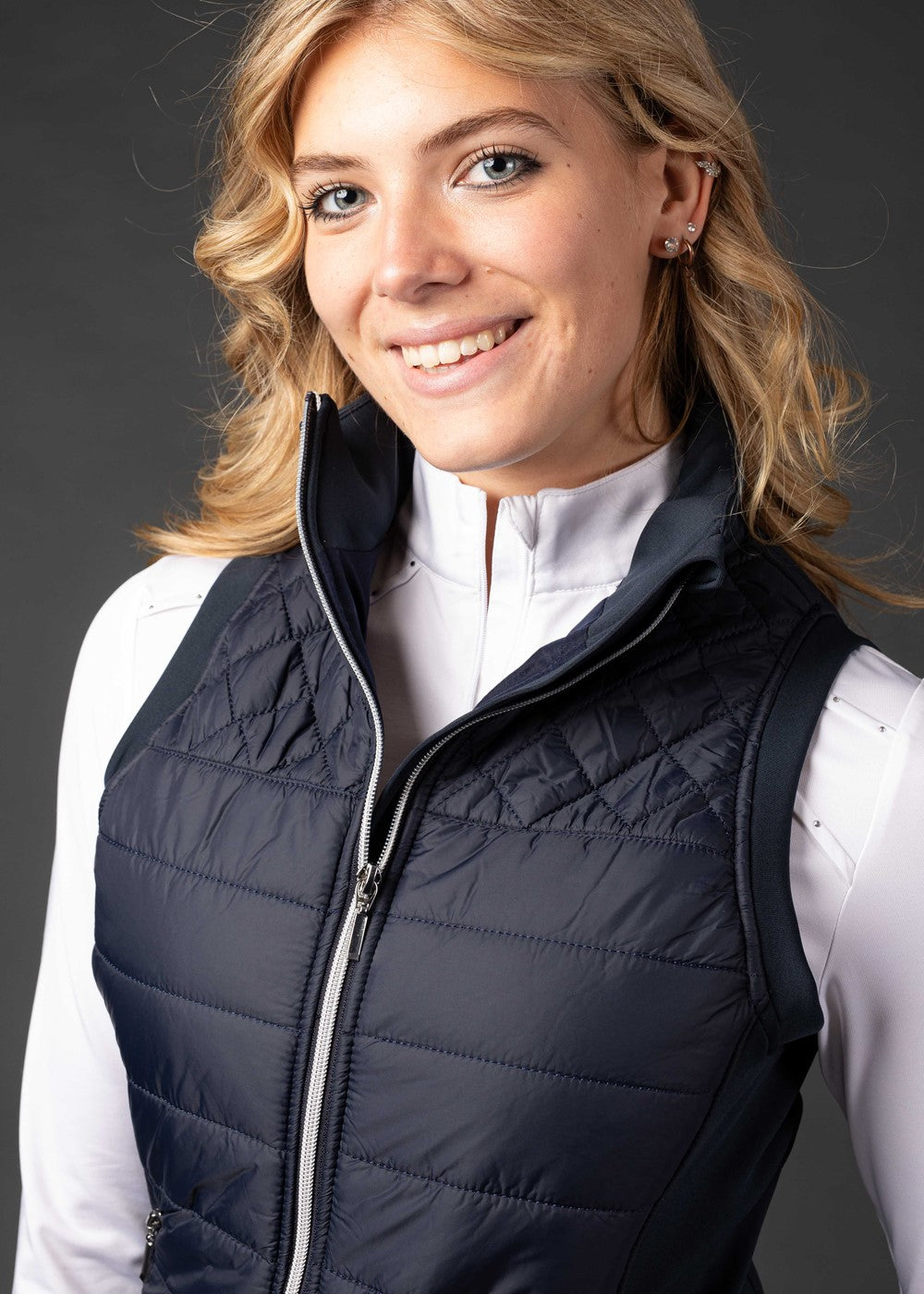 Sportlicher Bodywarmer mit gefüttertem Hauptteil und bequemen Stretch-Seitenteilen, einem Zwei-Wege-Reißverschluss und zwei Reißverschlusstaschen.