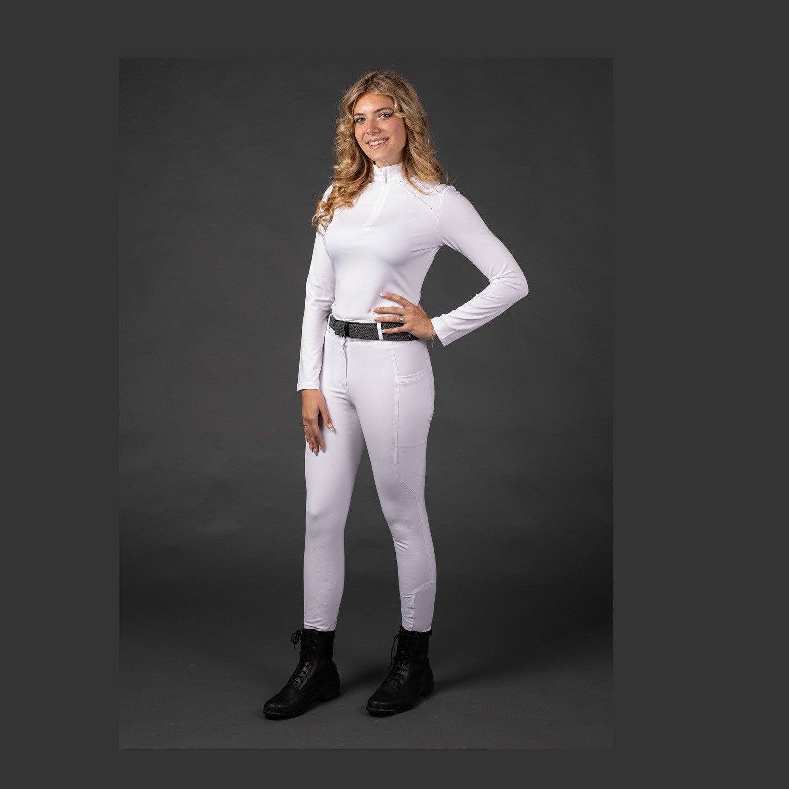 Reithose mit hohem Bund, zwei Seitentaschen mit silbernem EQS-Aufdruck, rundgenähtem Gesäß mit Silikonaufdruck für zusätzlichen Halt im Sattel und einem elastischen Einsatz um die Knöchel für mehr Komfort in Ihren Reitstiefeln.