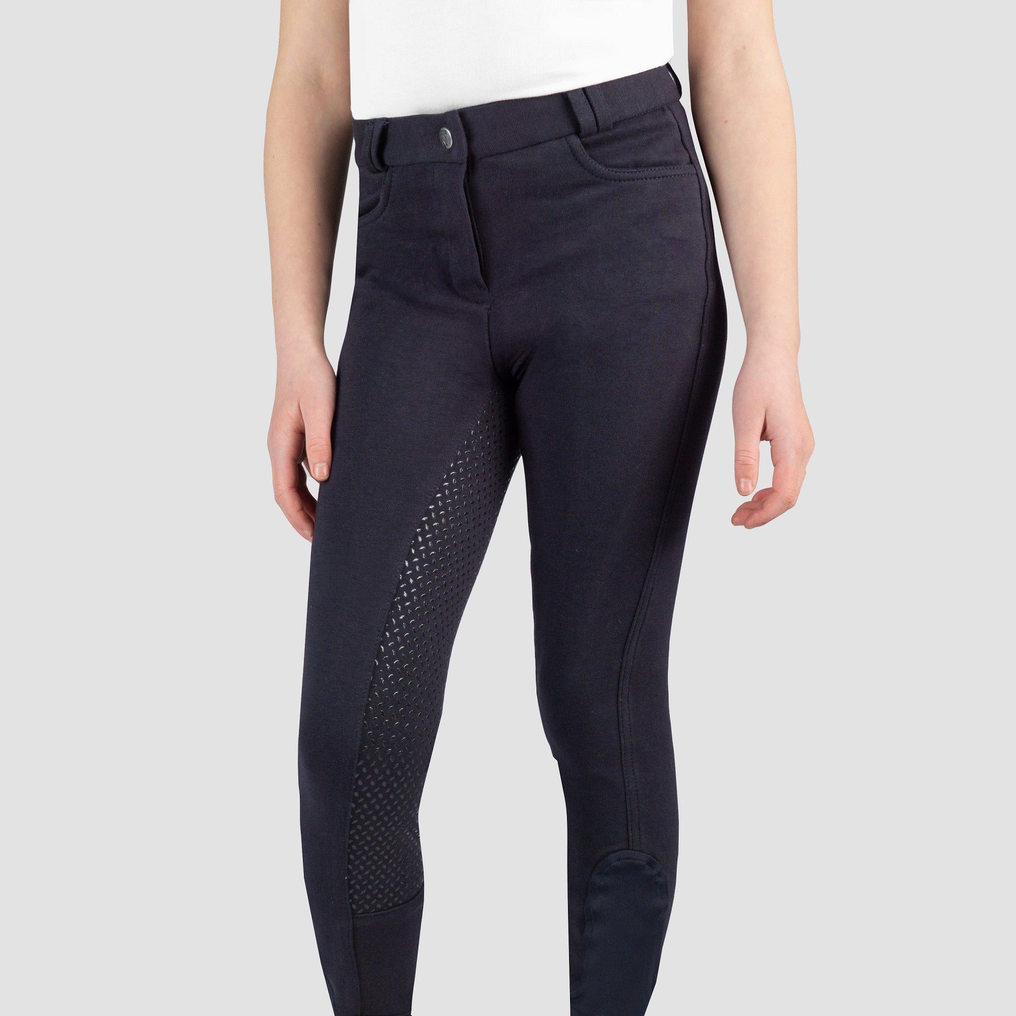 Einfache Junior-Reithose mit zwei Vordertaschen und einem matten Reiss-Silikon-Sitz. Produktspezifikationen: Einfache Reithose aus gestrickter Baumwolle, elastischer Knöchelverschluss, Gürtelschlaufen, zwei Vordertaschen, matter Silikon-Sitz. Material: 95 % Baumwolle, 5 % Elasthan, gestrickt