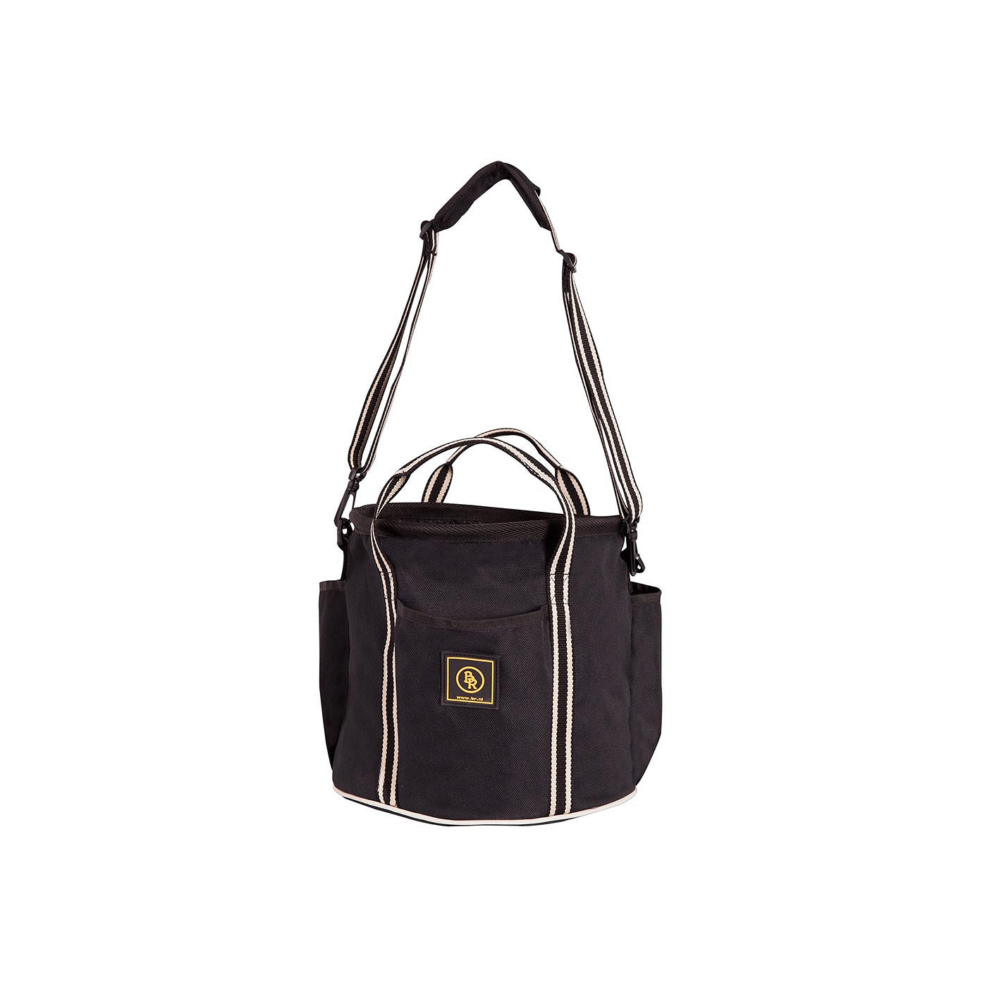Runde, leichte Putztasche aus 600D Polyester. Der verstärkte Boden ist mit vier Standfüßen zum Schutz ausgestattet. Die Oberseite lässt sich mit einem Kordelzug verschließen, so dass Sie den Inhalt abdecken können. Die Tasche hat rundherum drei Fächer. Die Tasche ist mit Griffen und einem abnehmbaren und verstellbaren Schultergurt ausgestattet. Diese Tasche ist sehr gut geeignet zur Aufbewahrung von Putzzeug und anderen Stallartikeln. Maße: 28 x 28 x 25 cm (L x B x H).