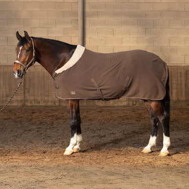 Fleecedeken met een dubbele borstsluiting en laag aangezette kruissingels en een staartlus. De deken heeft een comfortabele hals van kunstbont.