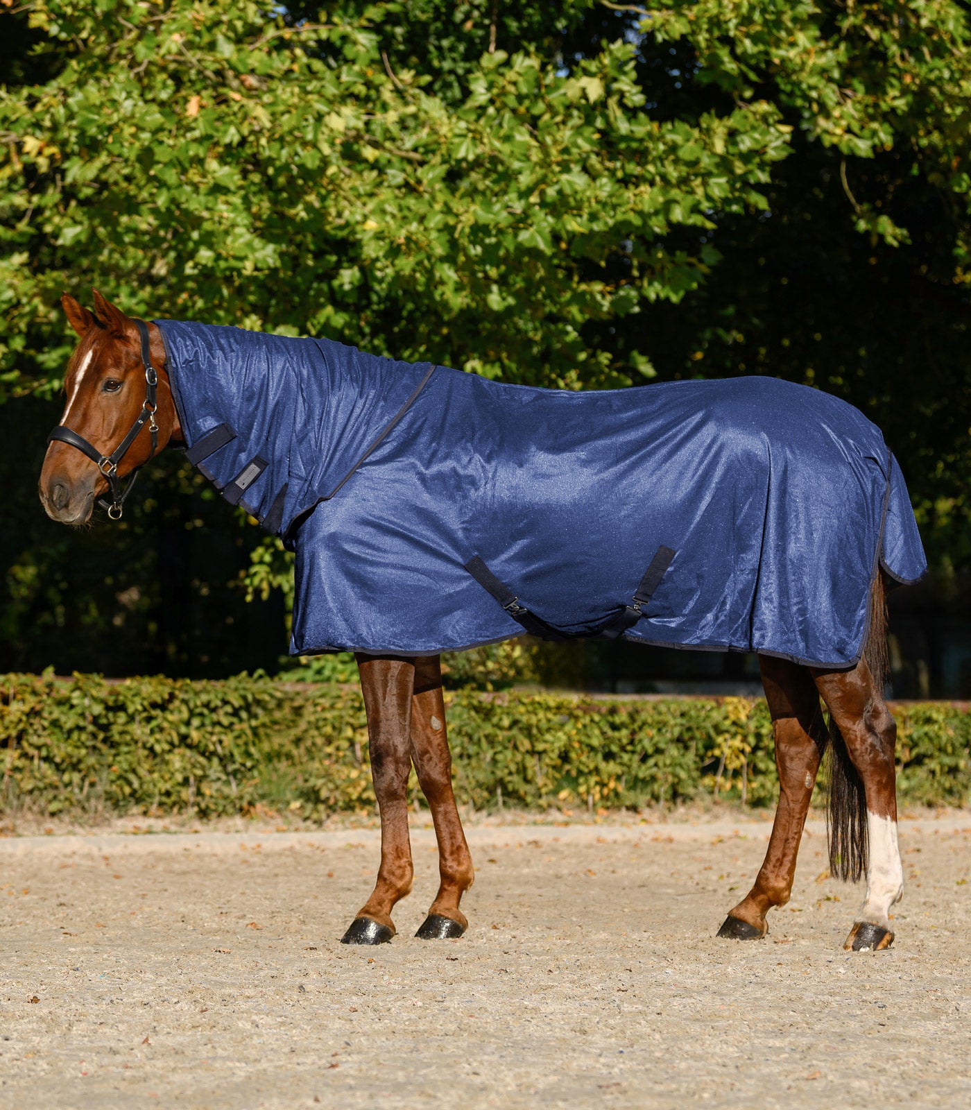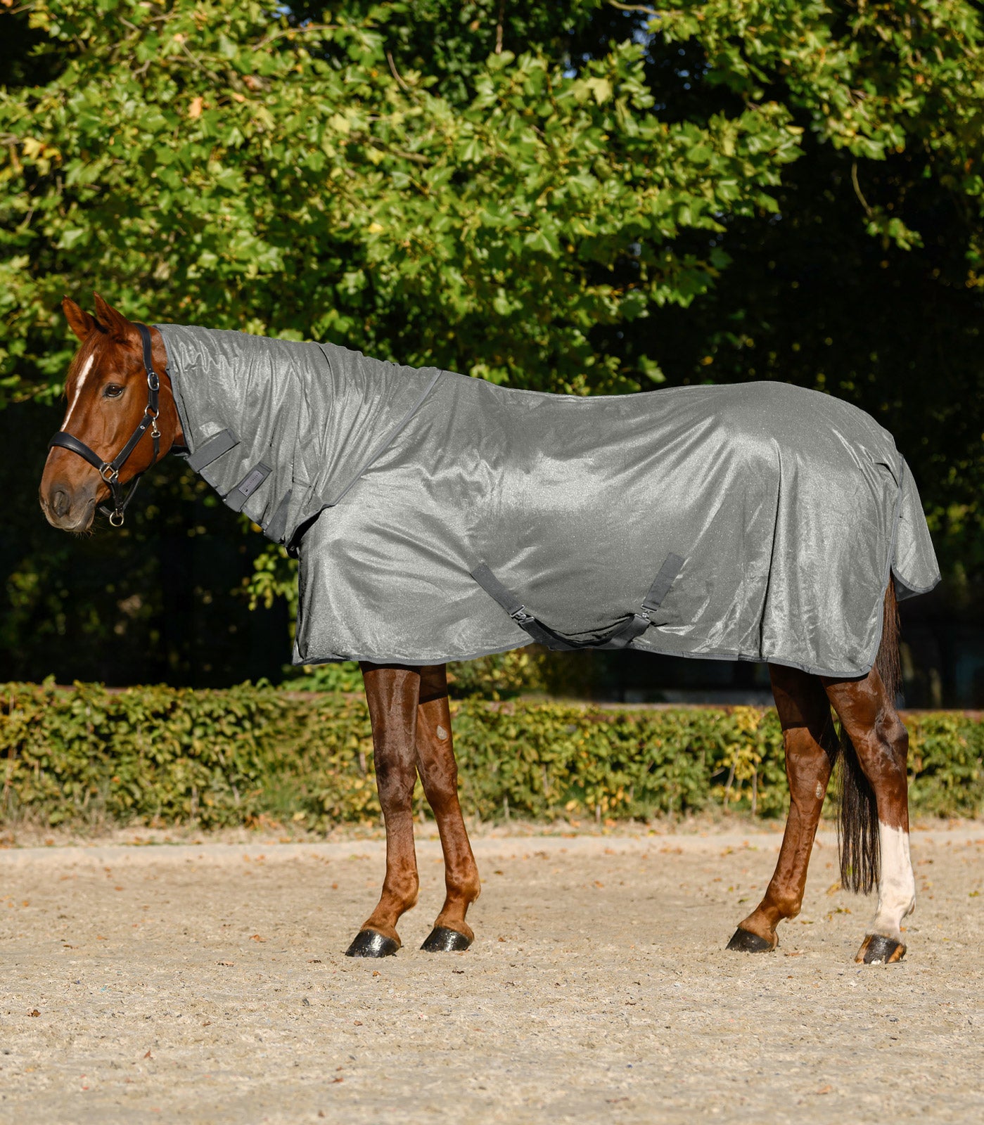 Diese hochwertige FlyControl Fliegendecke mit Halsschutz vereint Leichtigkeit, Atmungsaktivität und optimalen Schutz für Ihr Pferd. Das glänzende Material sorgt für ein angenehmes Tragegefühl auf Weide und Paddock und verhindert durch die Reflexion von Sonnenlicht eine Überhitzung. Gleichzeitig bietet die Decke zuverlässigen UV-Schutz und schützt Ihr Pferd auch an sonnigen Tagen. Der abnehmbare Halsschutz, die Beinschlaufen, die praktischen Kreuzschlaufen und der geräumige Schweifriemen garantieren einen sicheren Sitz und maximale Bewegungsfreiheit. Der weich gepolsterte Brustbereich und der T-Verschluss vorne erleichtern das An- und Ausziehen.