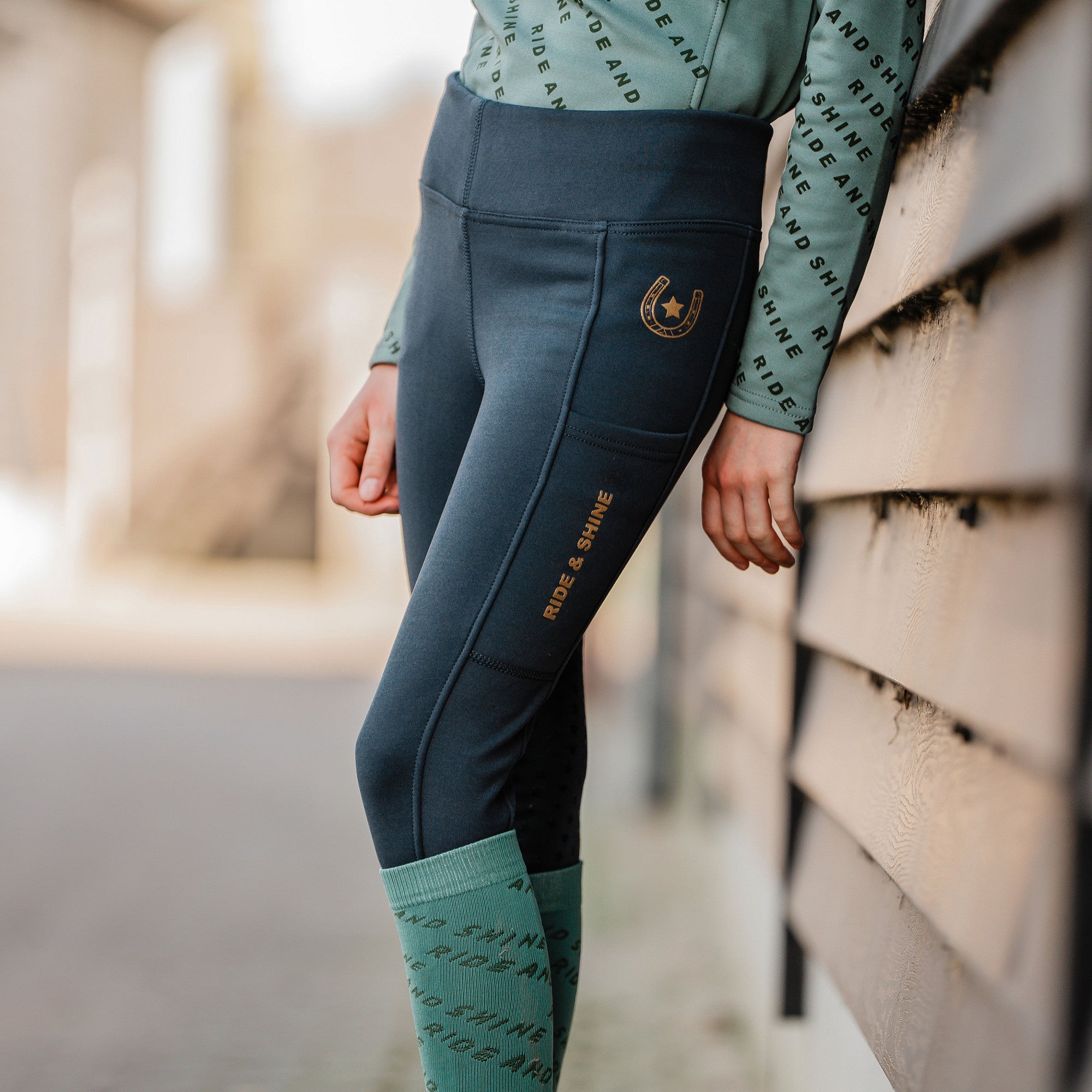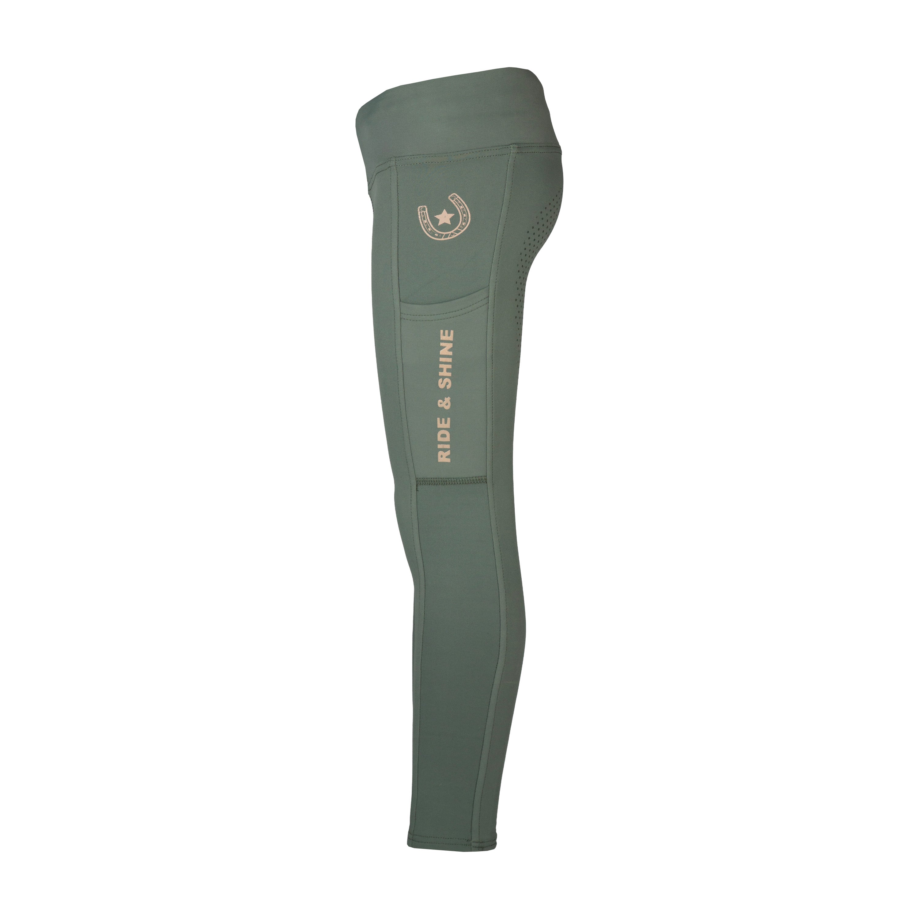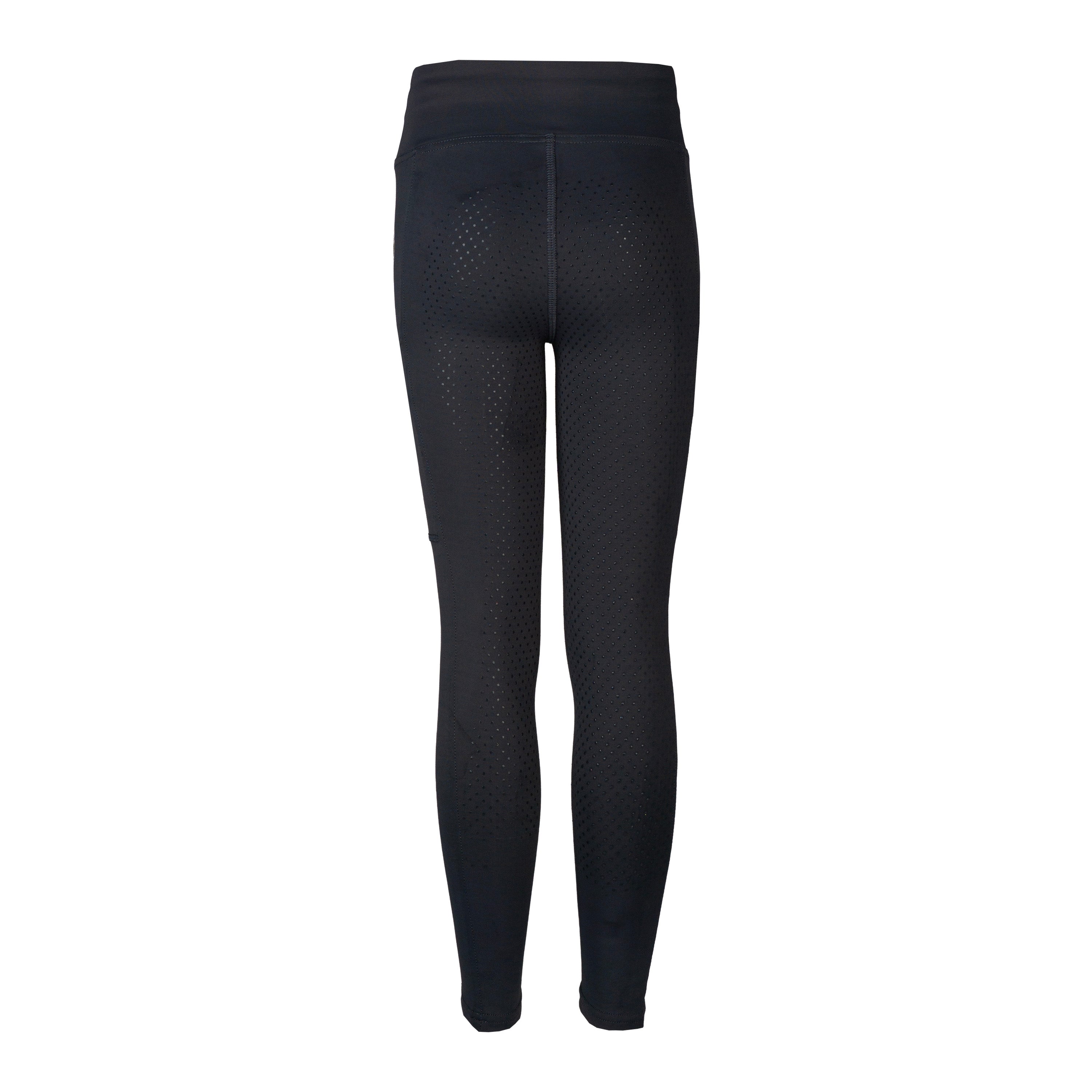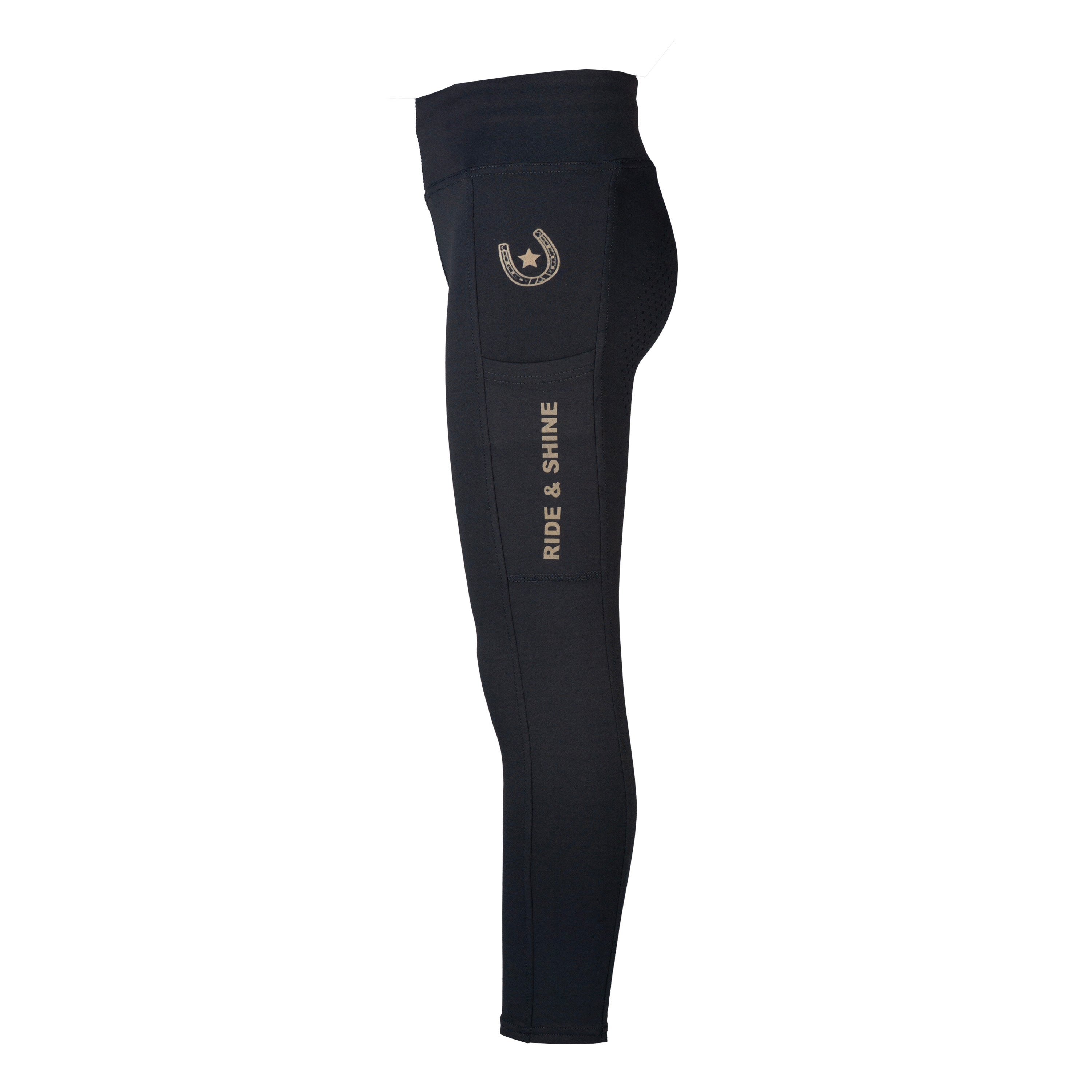 Reitleggings aus schnelltrocknendem und atmungsaktivem Stoff. Die Innenseite der Leggings ist für zusätzliche Wärme und Komfort gebürstet. Die Hose hat zwei tiefe Seitentaschen für Ihr Telefon, einen verstellbaren Bund für eine gute Passform und einen durchgehenden Silikonbesatz für zusätzlichen Halt. Die champagnergoldenen Details verleihen der Hose einen stylischen Look. Produktspezifikationen: < Reitleggings aus schnelltrocknendem und atmungsaktivem Stoff Innenseite gebürstet für zusätzliche Wärme Verstellbarer Bund an der Innenseite Zwei Seitentaschen, tief genug für ein Telefon Champagnergoldene Verzierungen und Akzente Durchgehender Besatz mit Silikondruck Material: < 90 % Polyester, 10 % Elastan (innen gebürstet)