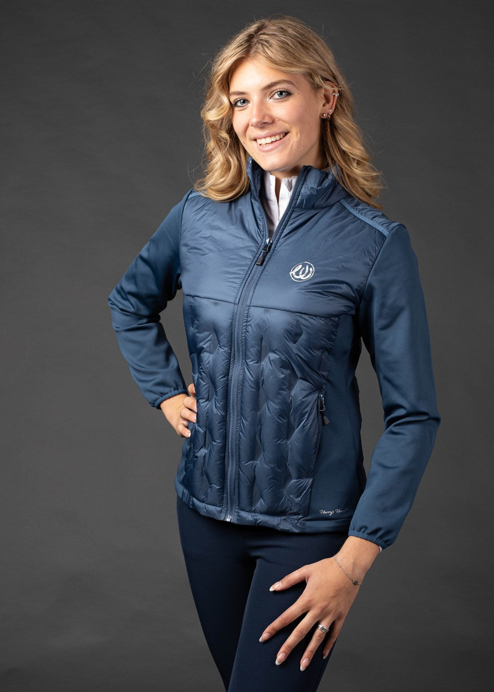 Veste sportive, légèrement doublée sur le corps, zip double sens, deux poches zippées, deux poches intérieures, logo sur la poitrine.