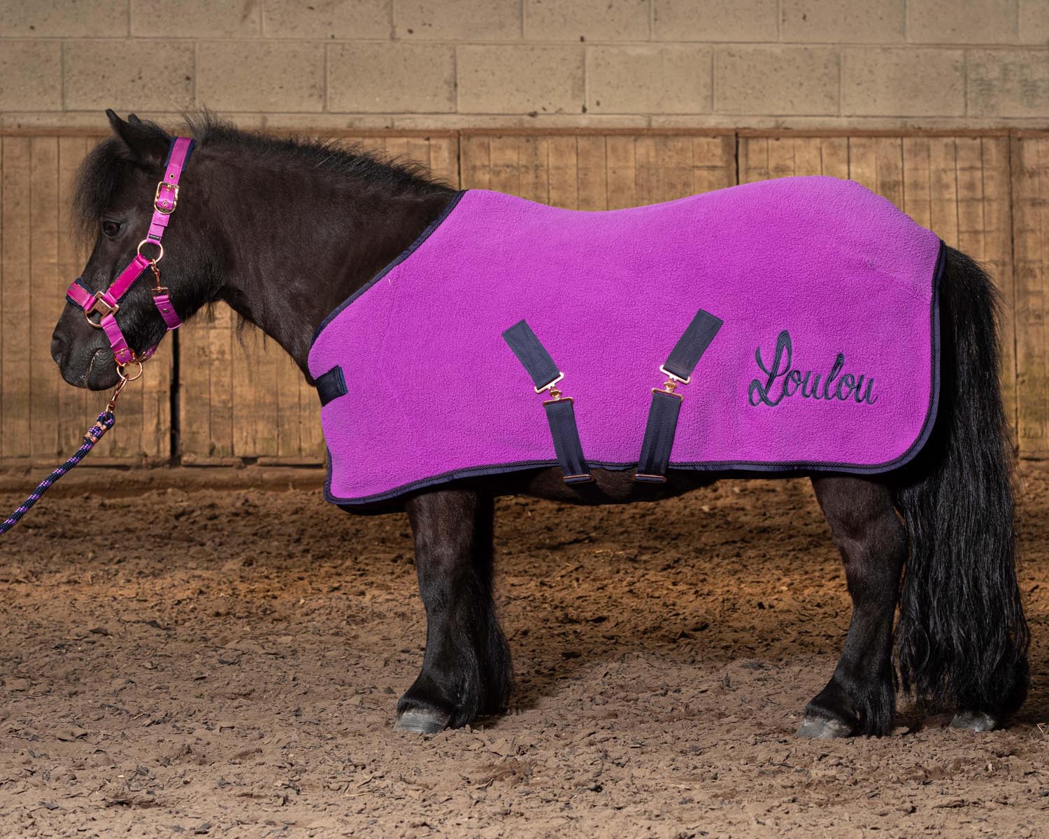 Fleecedeken met een enkele voorsluiting, kruissingels en een staartlus. Het LouLou logo is op de linkerkant geborduurd en de deken heeft rondom een sierkoord.