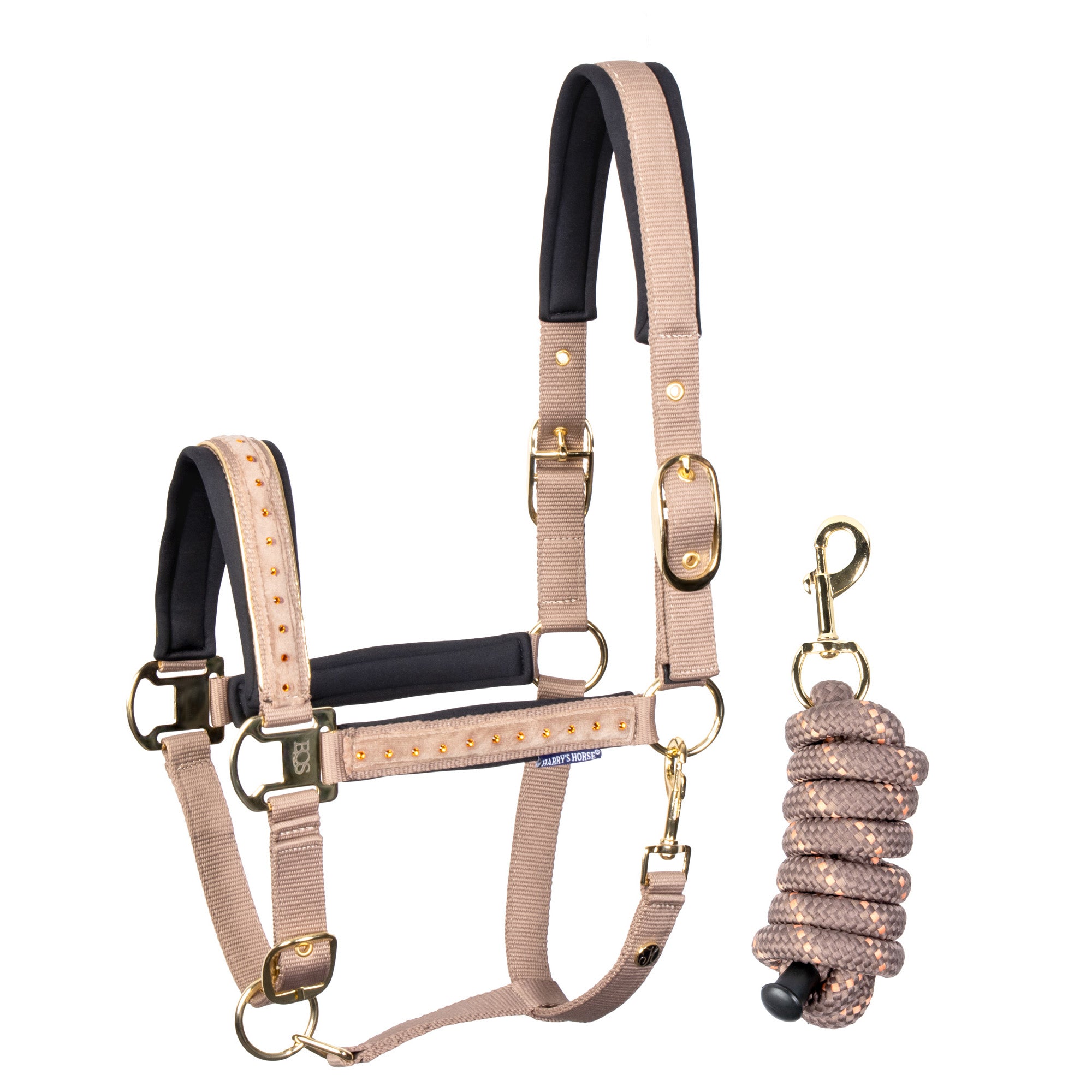 Ce luxueux licol est élégamment orné de cristaux scintillants sur la muserolle et les montants. Il est doté d'un rembourrage doux en néoprène aux points de contact pour un confort optimal et pour prévenir les irritations. La têtière (des deux côtés) et la muserolle sont réglables pour un ajustement parfait. Une longe assortie de 2 mètres est incluse.