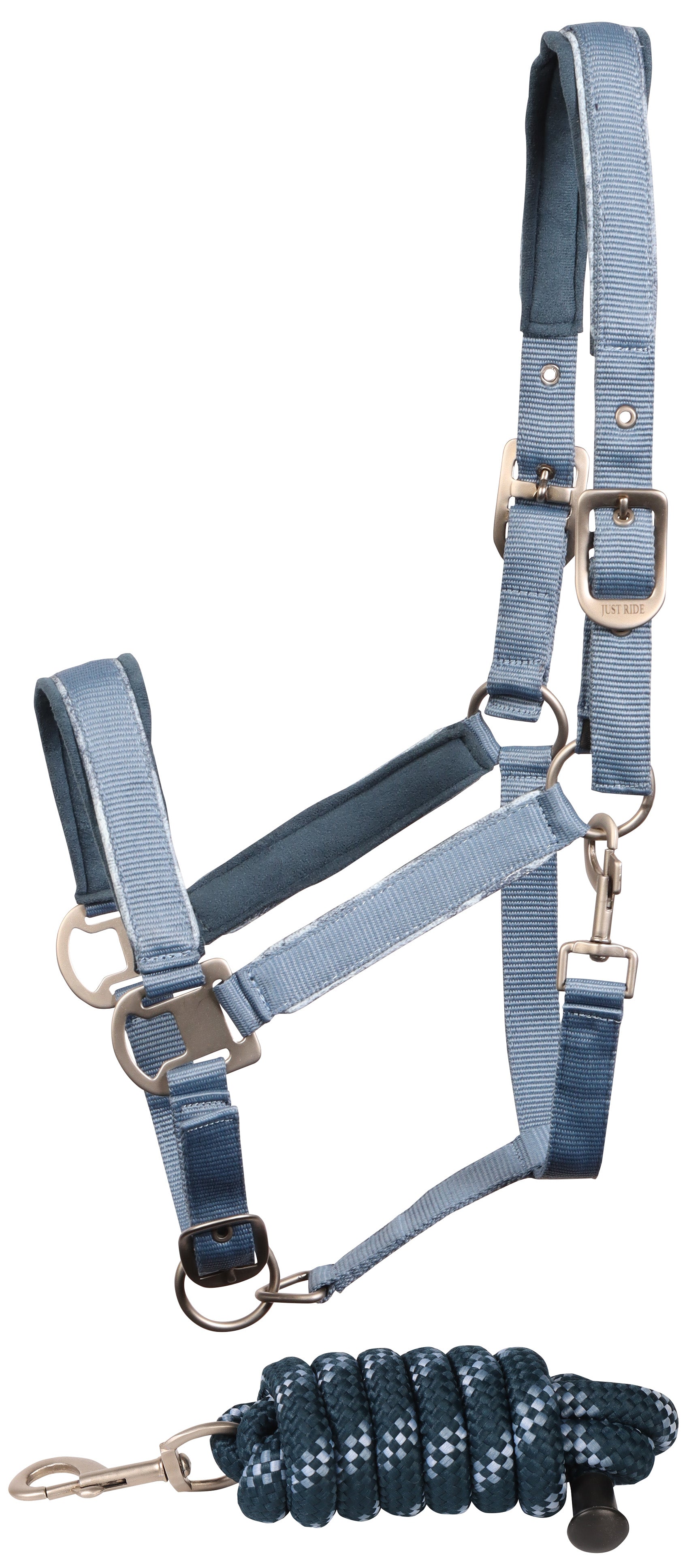 Halster met een contrasterende sierbies, met een zachte neopreen voering en is dubbel verstelbaar op het kopstuk en verstelbaar op de neus en inclusief een halstertouw van 2 meter.