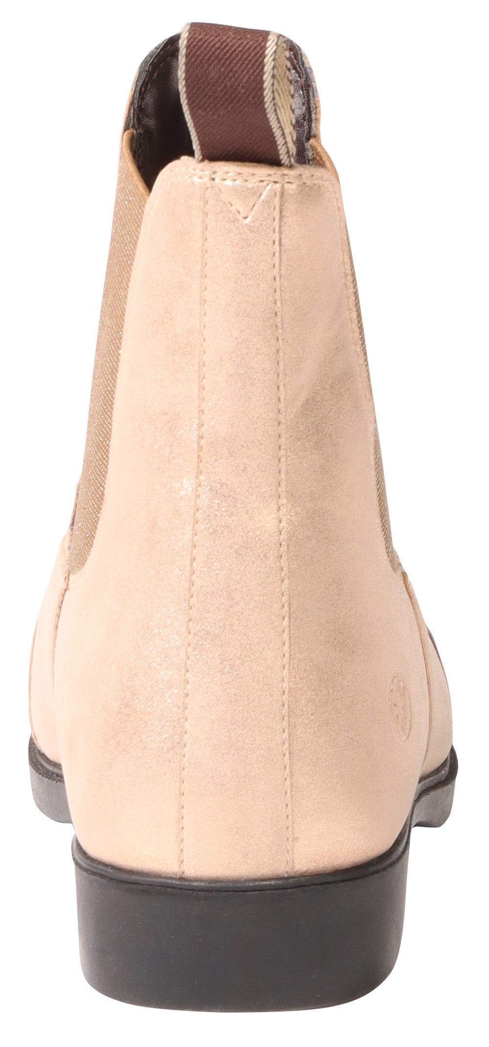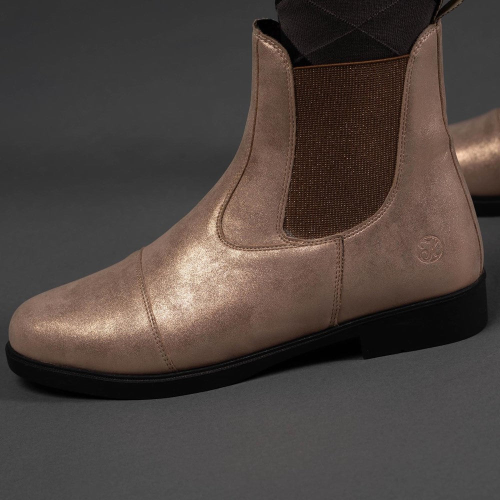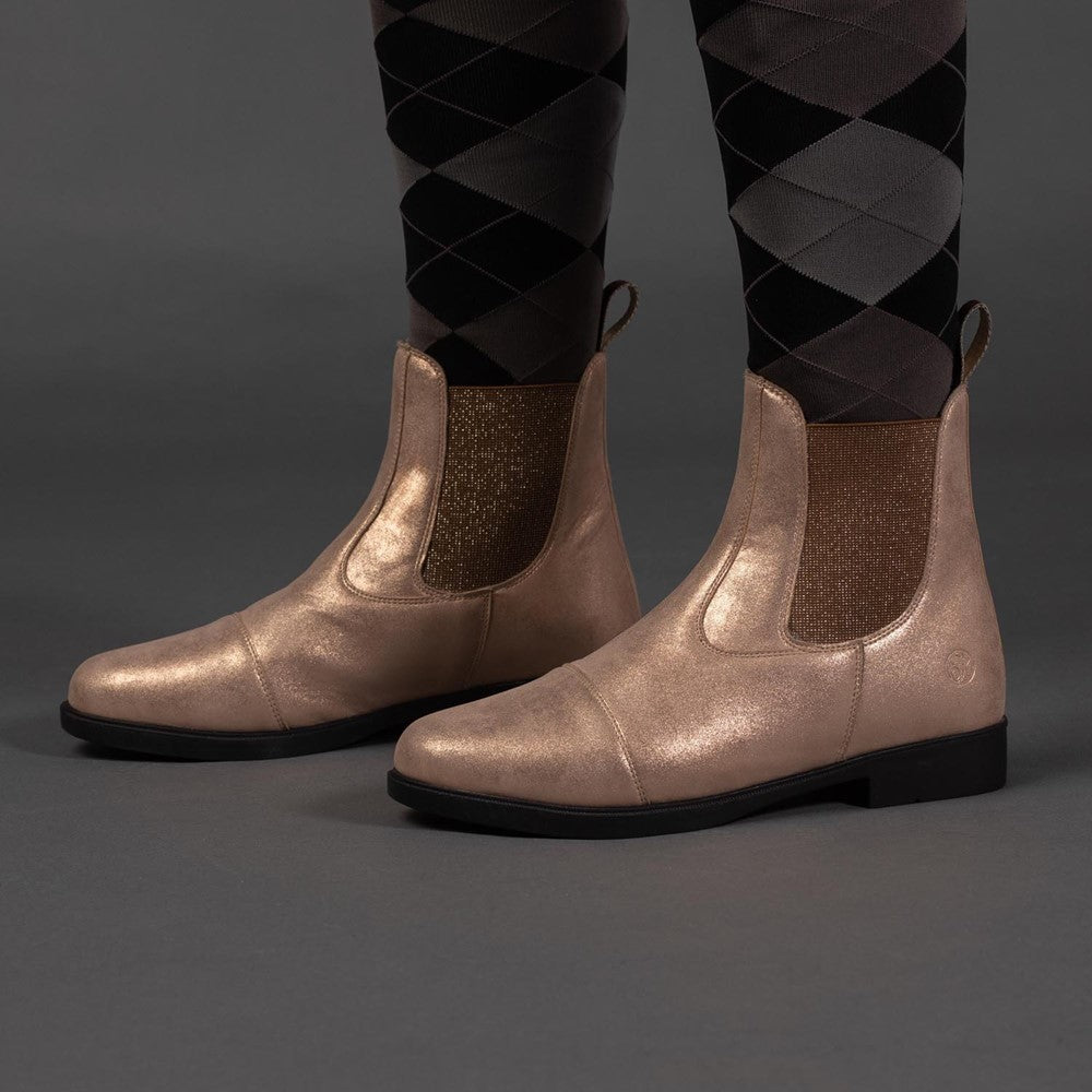 Jodhpurs en cuir synthétique avec effet pailleté or rose, insert élastique avec paillettes et semelle en caoutchouc.