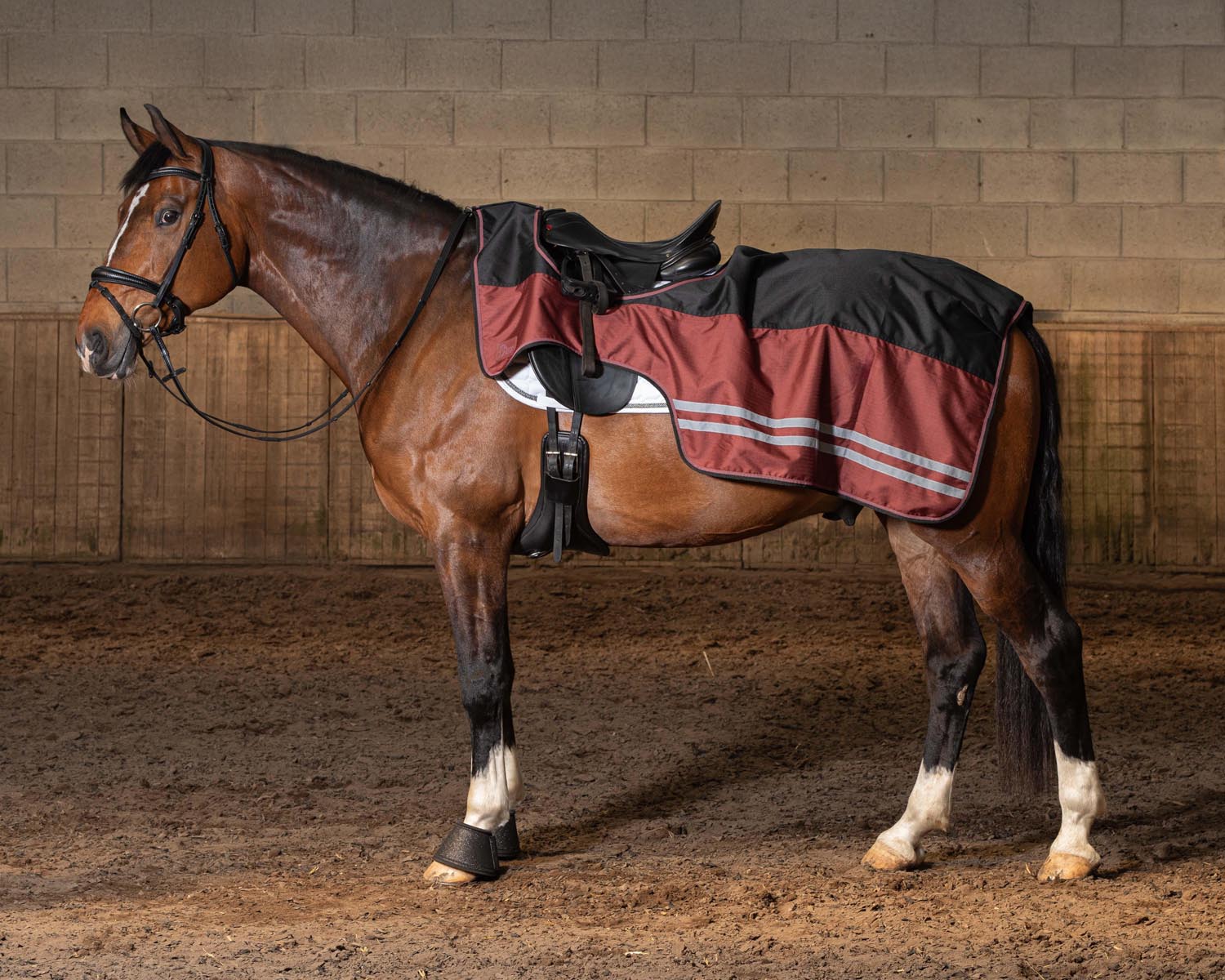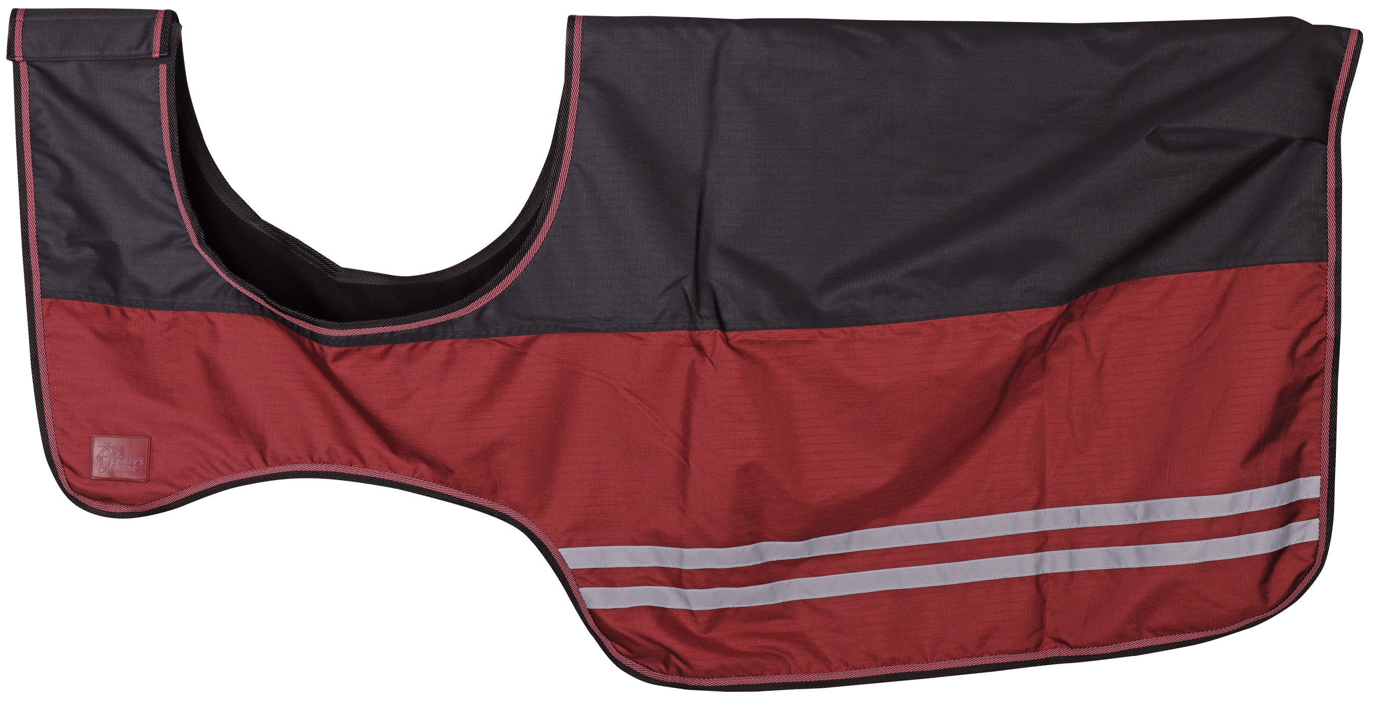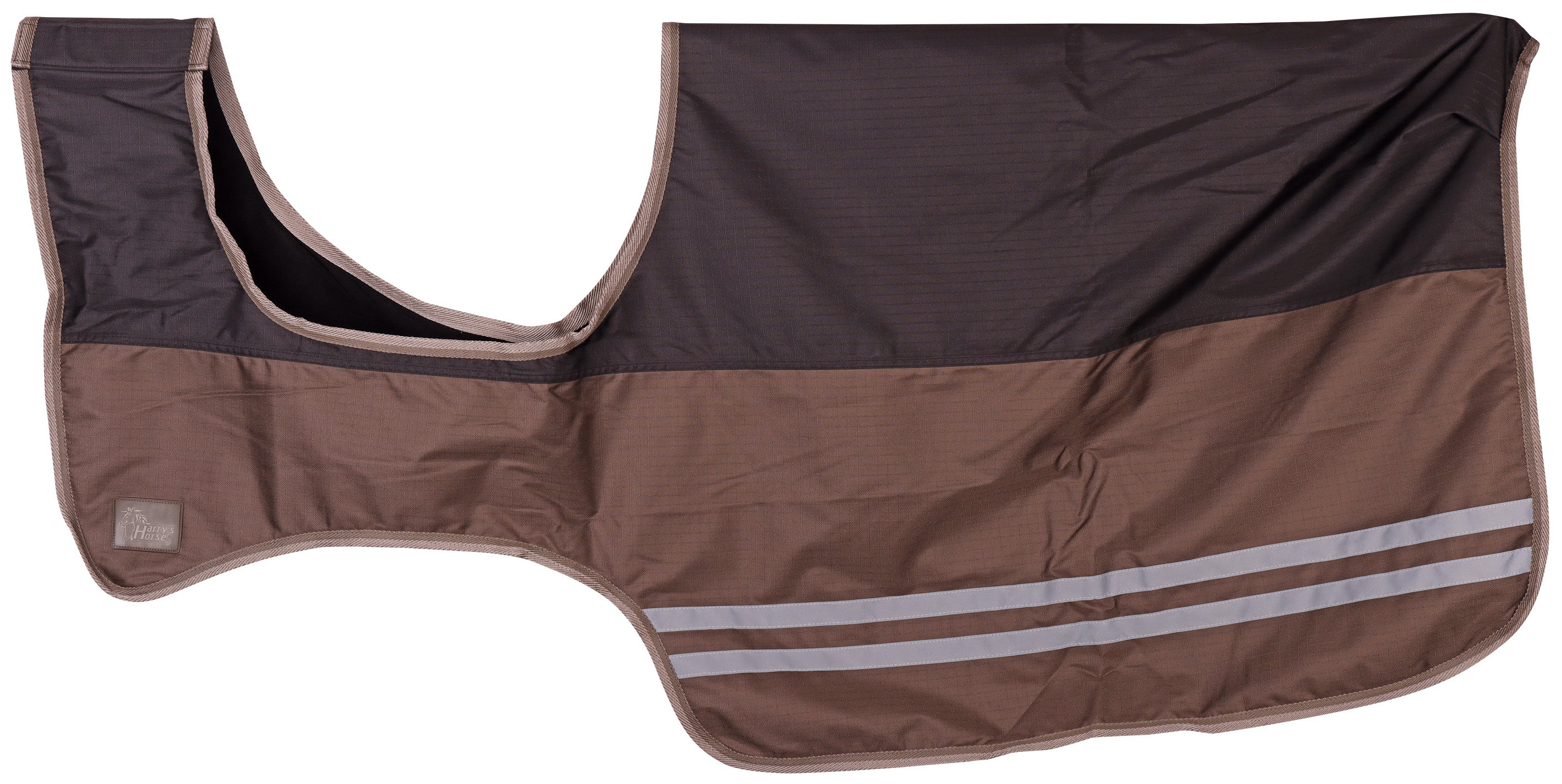 Waterdichte uitrijdeken met reflecterende strepen aan de zijkant voor goede zichtbaarheid in het donker. Naadloos op de rug, uitgevoerd met staartlus en voorzien van fleecevoering en een klittenbandsluiting voor het zadel.