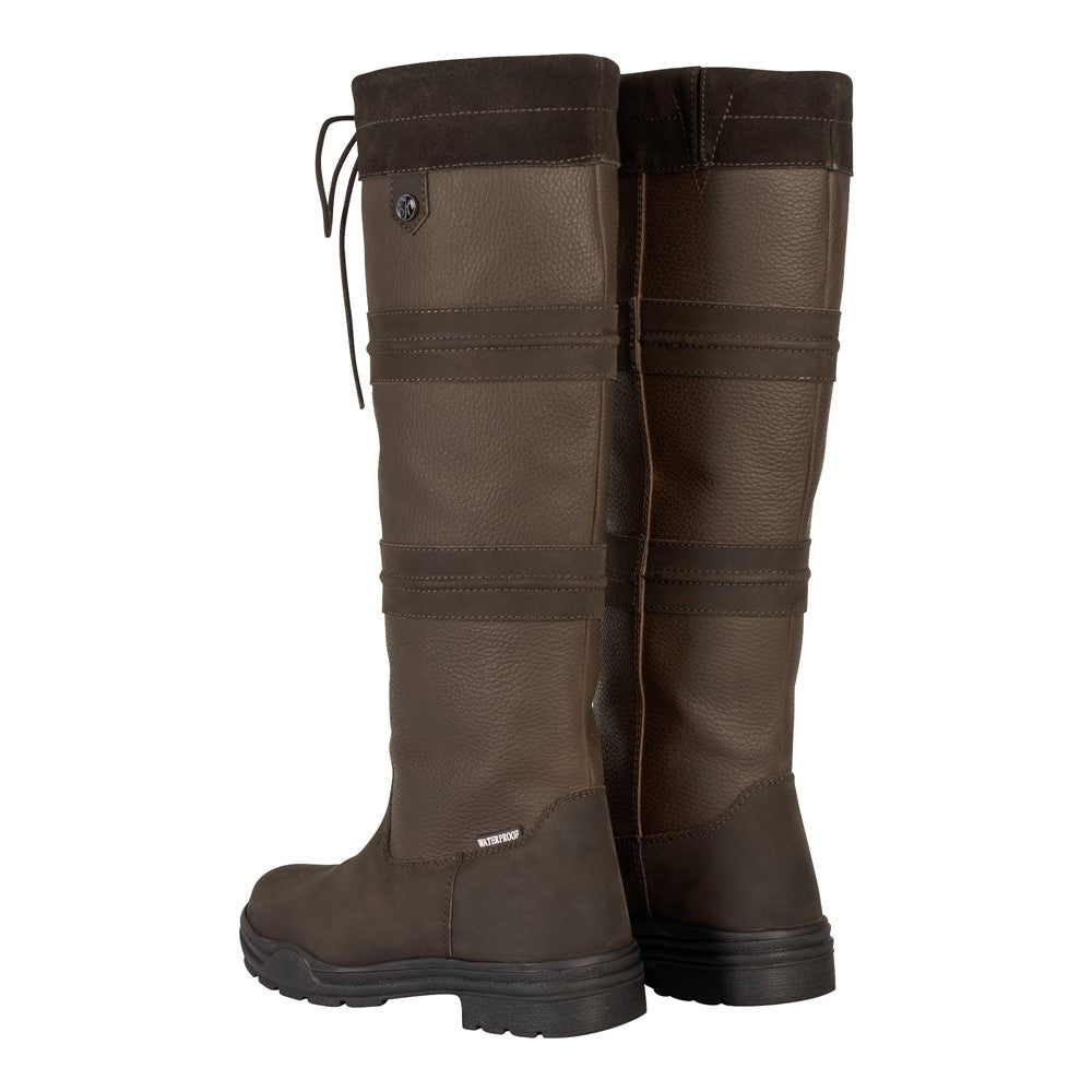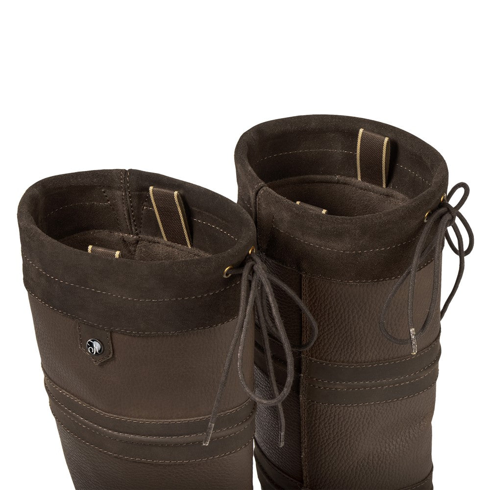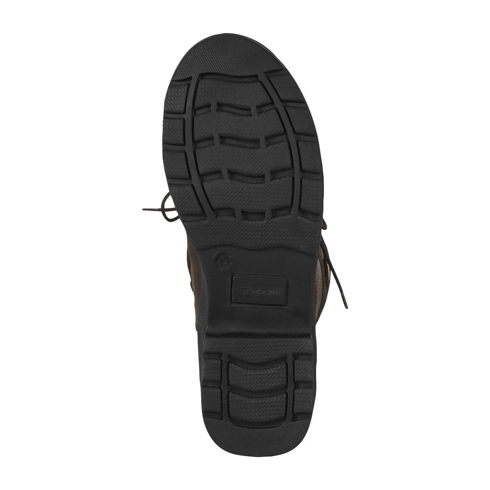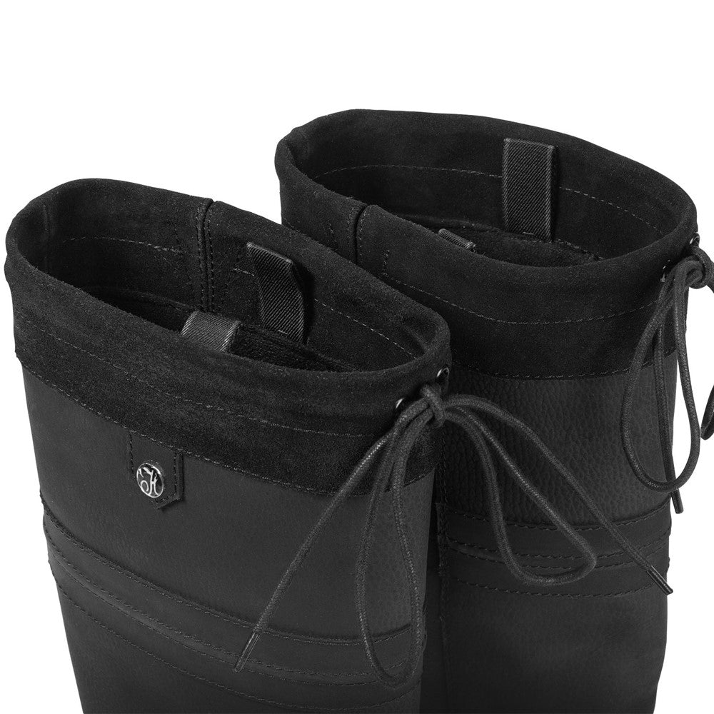 Botte d'extérieur contemporaine avec semelle en caoutchouc et cuir pleine fleur hydrofuge. Entièrement doublée d'un matériau imperméable et d'une membrane spéciale empêchant l'eau de pénétrer. Cordon de serrage inclus.