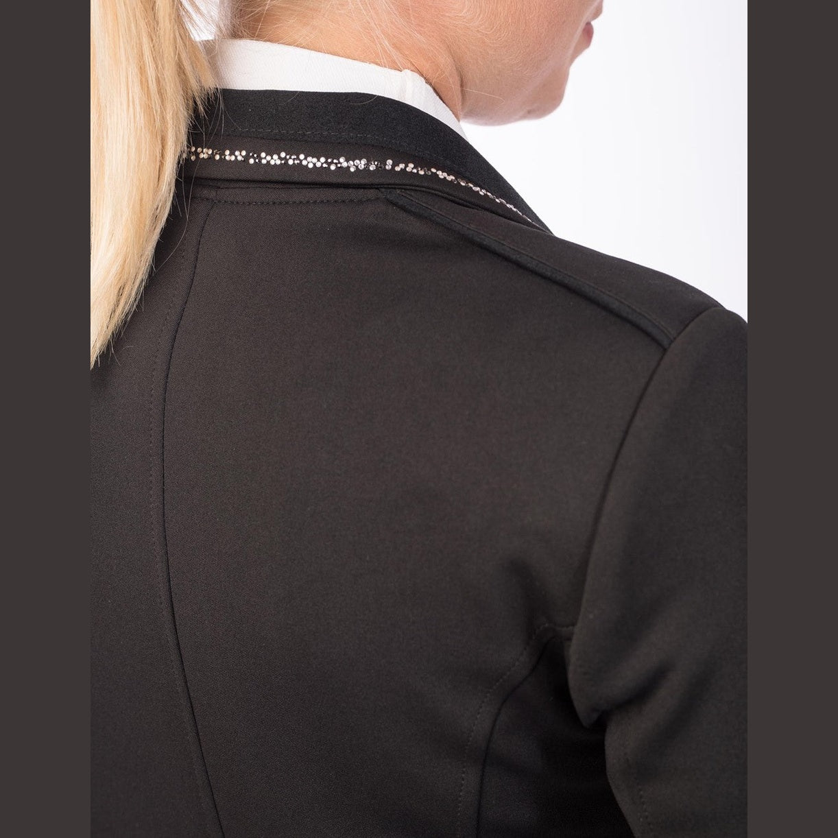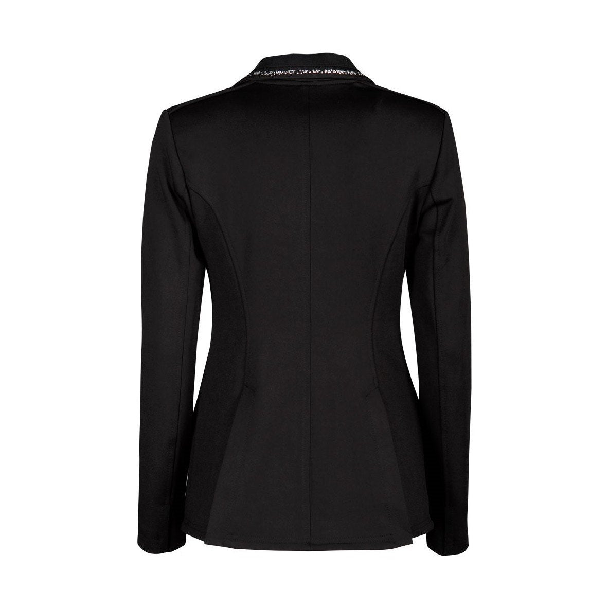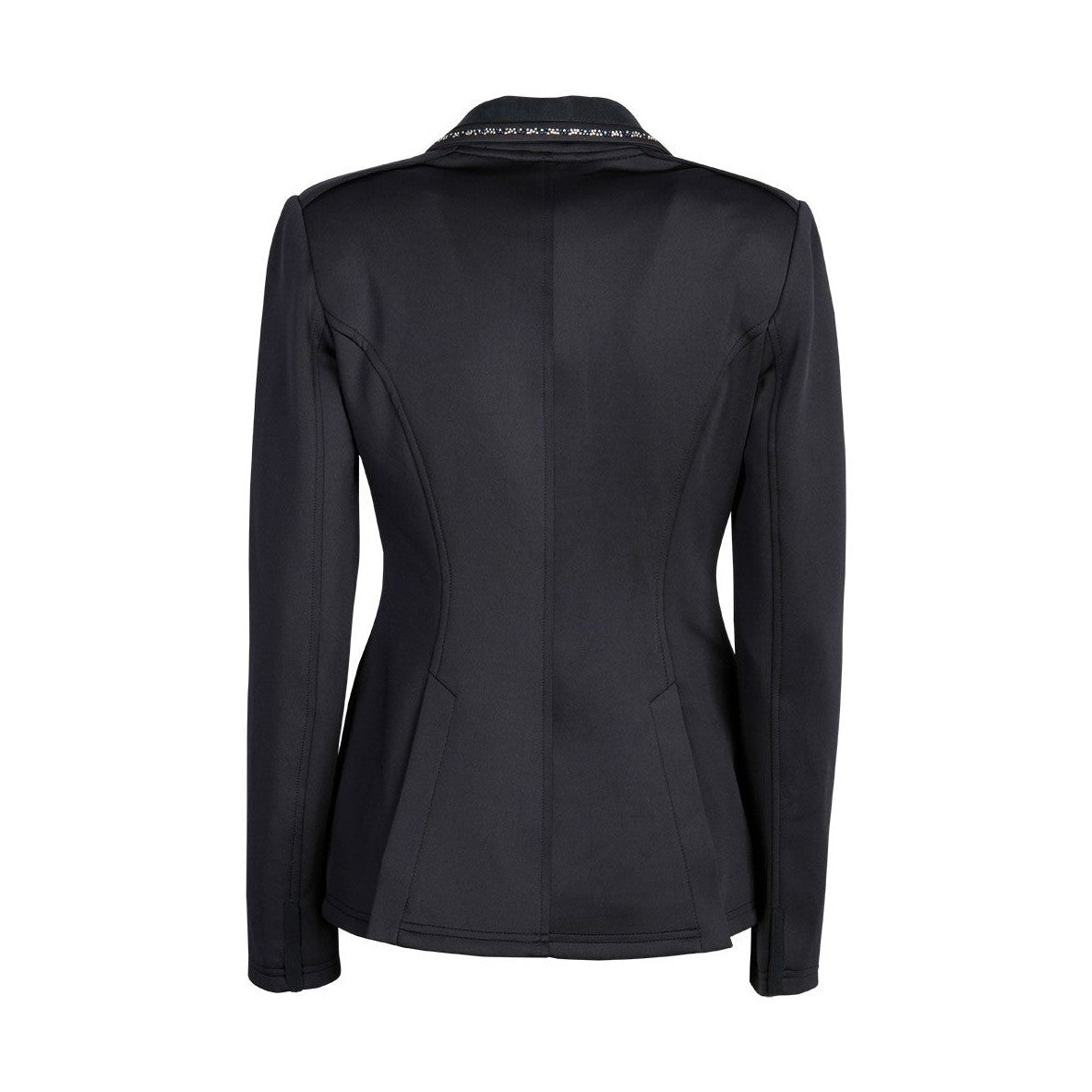 Veste de compétition moderne, confectionnée en matières extensibles de haute qualité. Elle est ornée de petits cristaux sur le col et de poches passepoilées, également dotées d'une fermeture éclair dissimulée. La fermeture éclair avant est associée à une fermeture boutonnée.