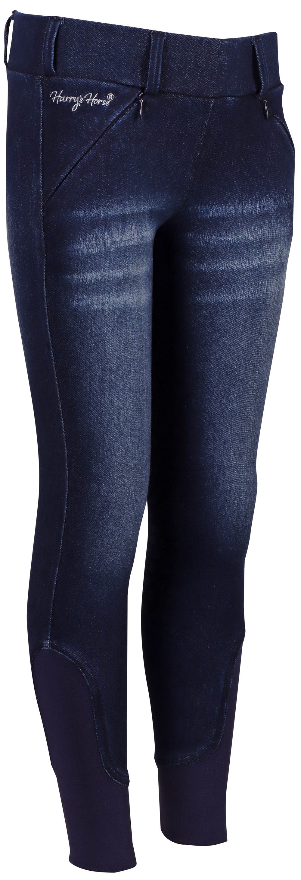 Denim look rijlegging met leuke wassing en Diva logo's een badge op de tailleband, riemlussen, twee zakken, rondgenaaid zitvlak voorzien van een siliconen print en een elastische inzet rond de enkel voor meer comfort in je paardrijlaarzen.