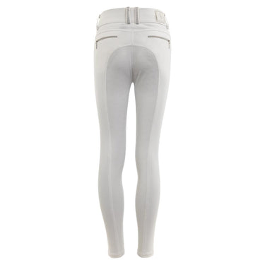 De rijbroek heeft een hoge tailleband met twee haak-en oogsluitingen en knoopsgatelastiek, zodat de tailleband strakker gemaakt kan worden. Enkele riemlussen zijn opgeleukt met zilveren glittermateriaal, net als de jeanszakken op de voorzijde. Op de achterzijde bevinden zich twee ritszakken.