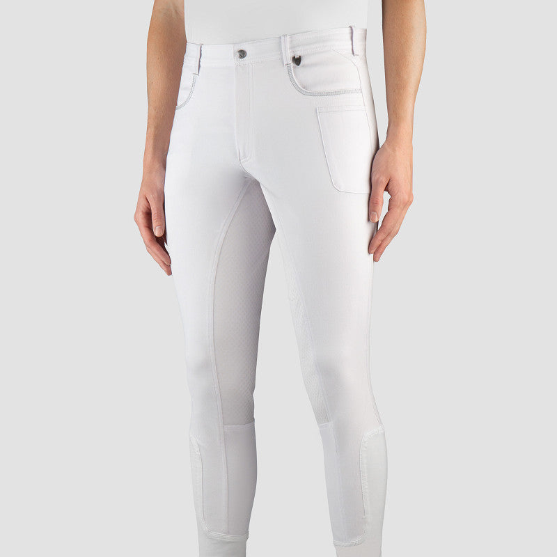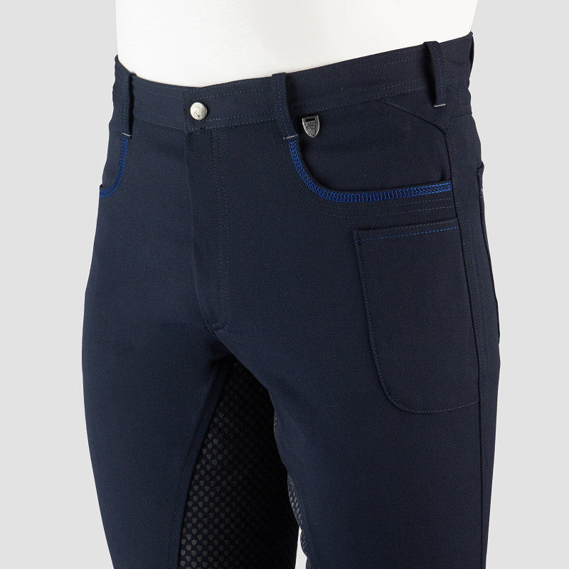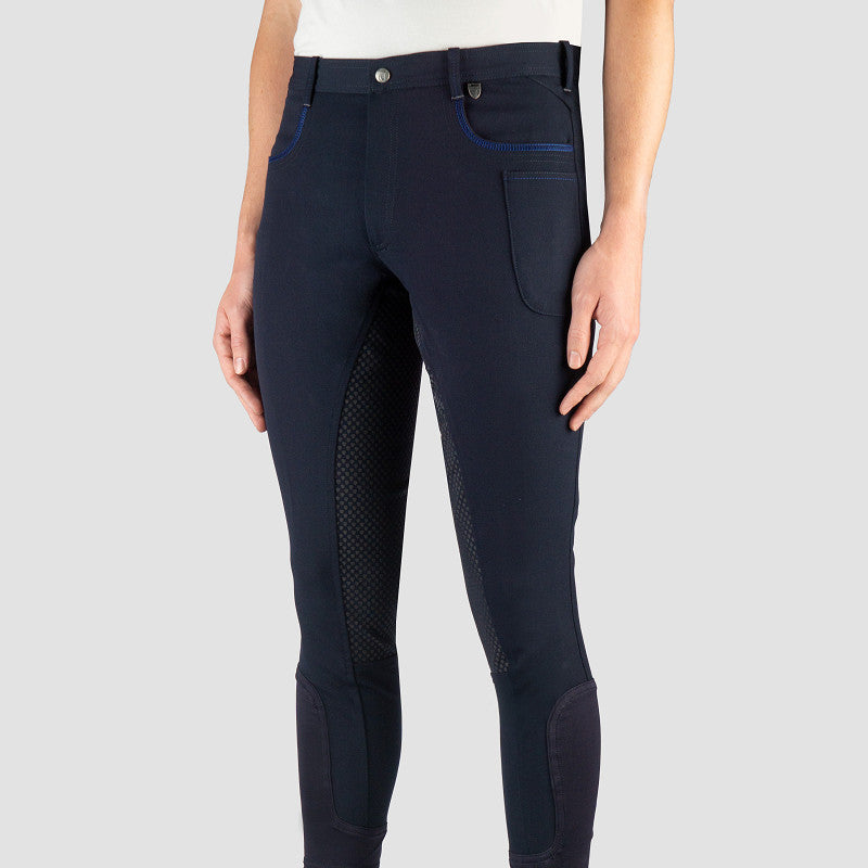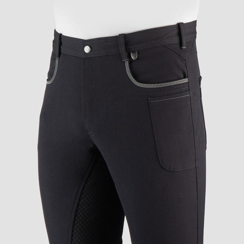 Moderne mannenrijbroek gemaakt van een technische stof. De broek heeft een siliconen zit voor goede grip in het zadel. Details in contrasterende kleuren en een broekzak voor de telefoon maken de broek af. Productspecificaties: Moderne mannenrijbroek gemaakt van een technische stof Matte siliconen zit met binnenvoering Broekzak waar een mobiele telefoon in past Details in contrasterende kleuren Materiaal: 62% polyester 33% viscose 5% spandex geweven