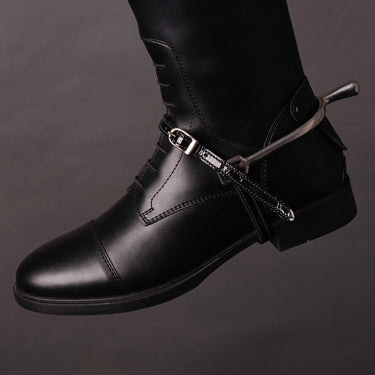 Laklederen spoorriemen met luxe, fijne gespsluiting. Lengte 47 cm.