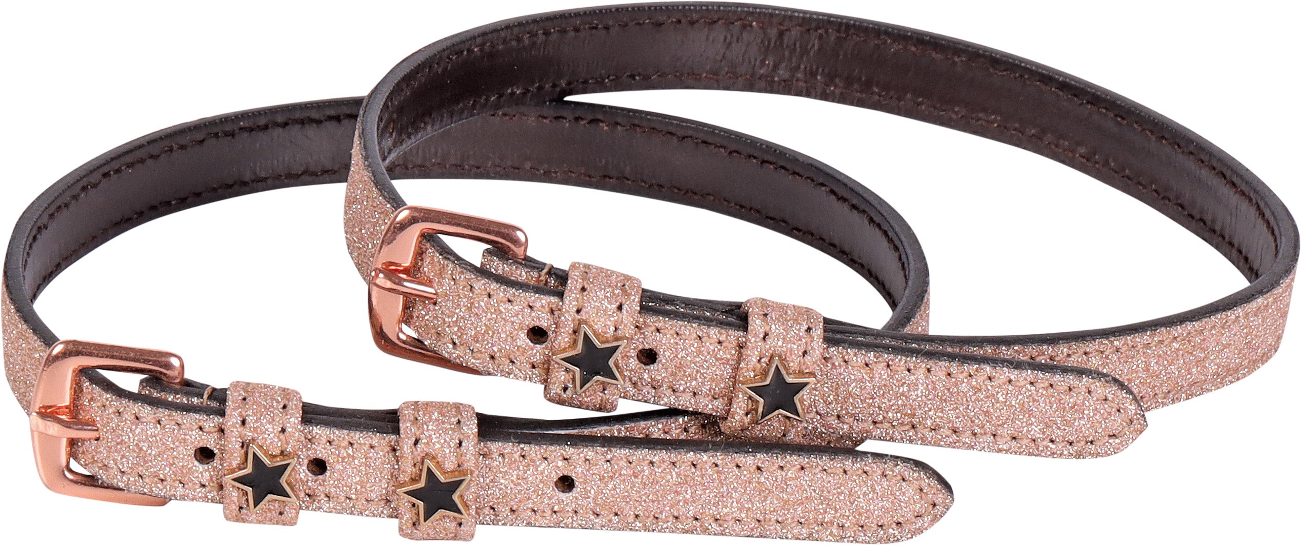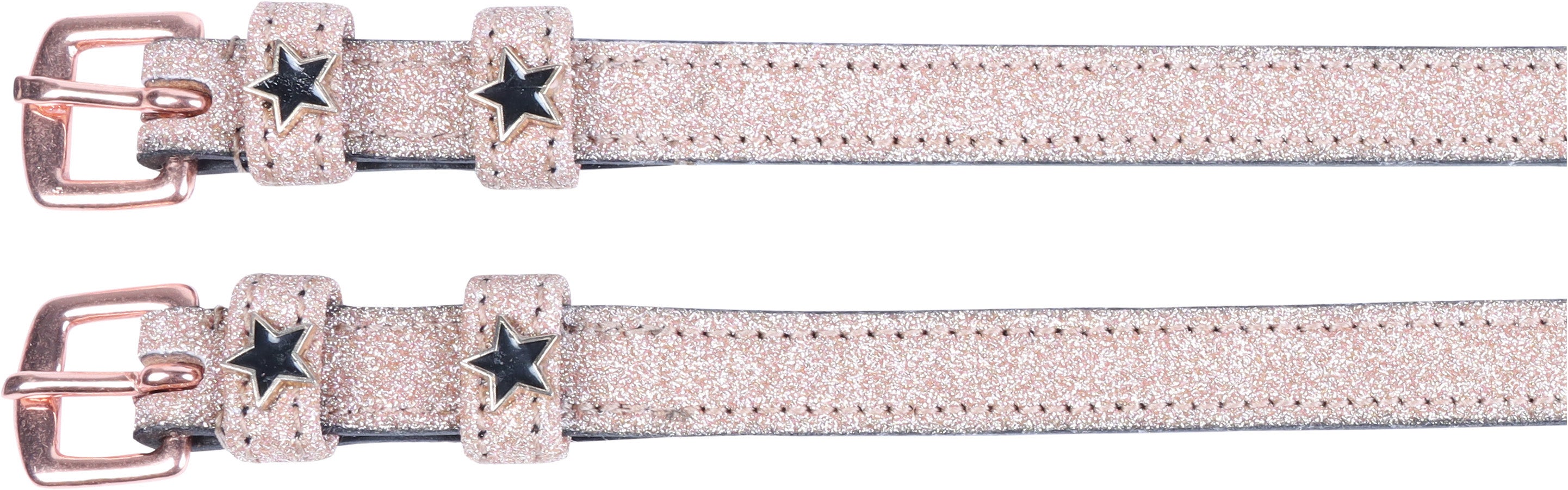 Lederen spoorriemen met rosegold glitters. Voorzien van bijpassende sterretjes op de passanten. Rosegold gespen.