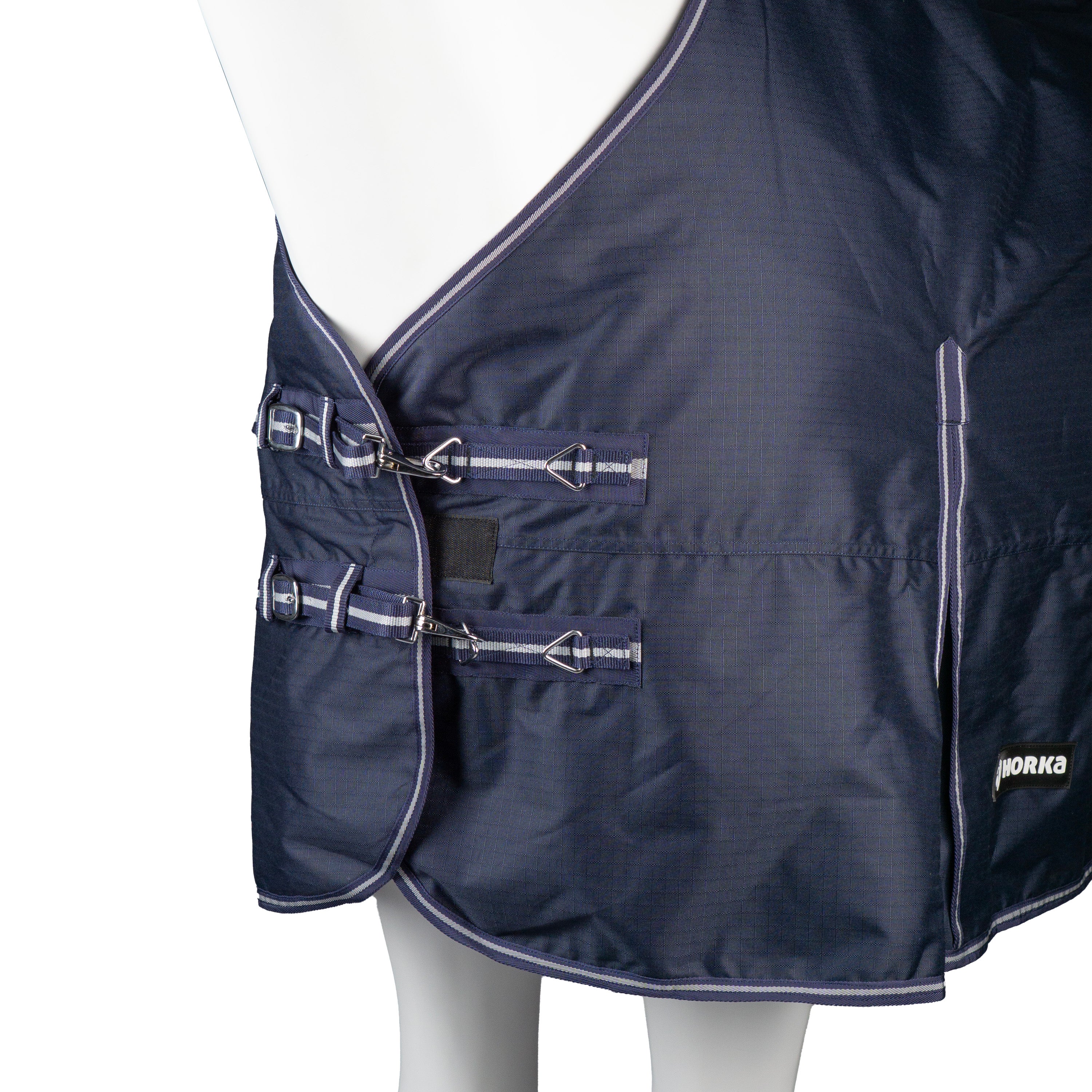 200 grams deken uitgevoerd met schoftbeschermer dubbele borstsluiting kruissingels en afneembare bilkoorden. Productspecificaties: 600D rip stop polyester 3000 mm waterdicht en 3000 mvp ademend 200 grams vulling polyester voering Dubbele haaksluiting en klittenband op de borst Kruissingels met elastisch uiteinde en rubberen stops Afneembare bilkoorden Schoftbeschermer
