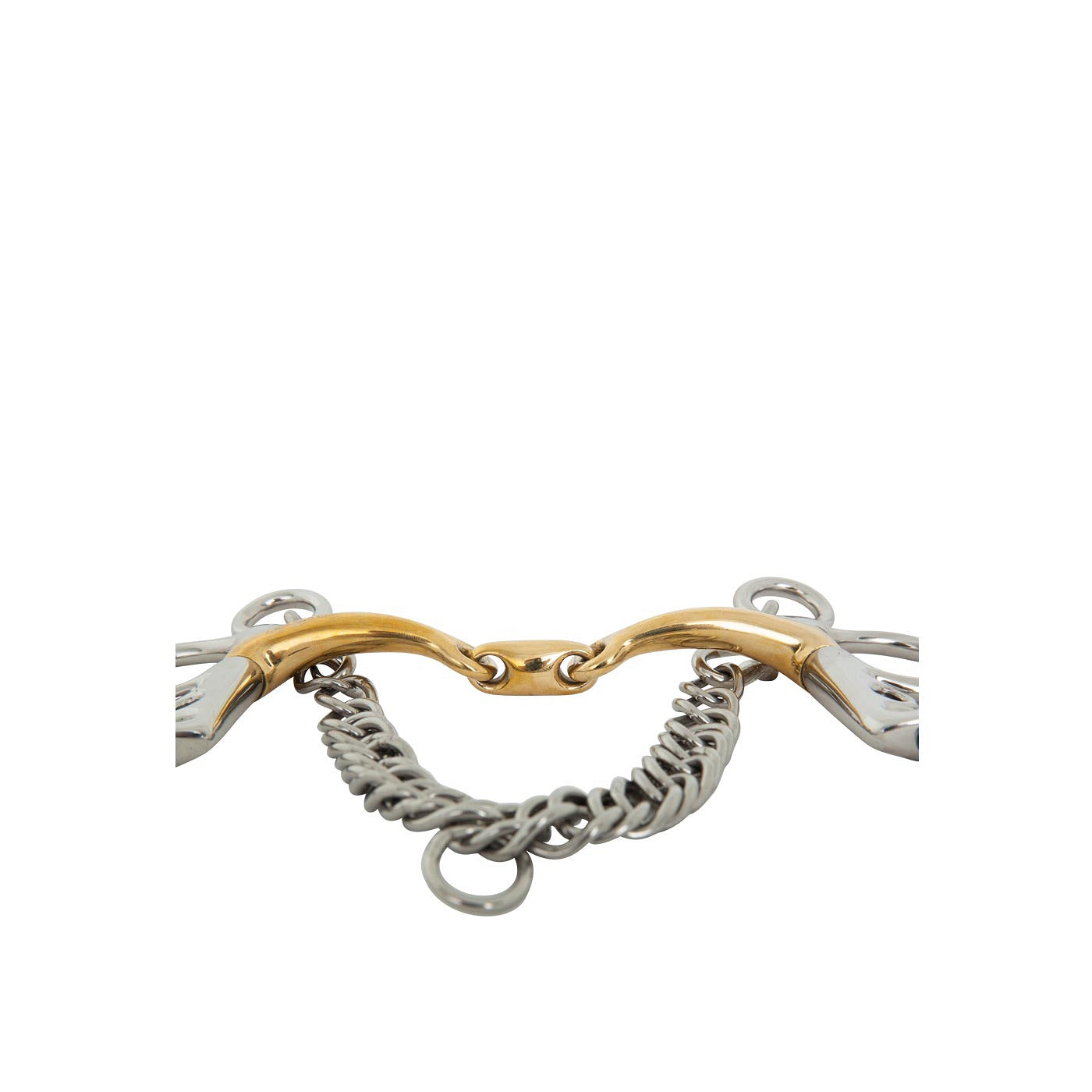 Dit kwalitatief hoogwaardige dubbel gebroken Baby Pelhambit, met losse scharen en hefboomwerking, is vervaardigd van massief Cuprigan met roestvrijstalen ringen. Cuprigan is een legering bestaande uit 89% koper, 7% aluminium, 3% ijzer en 1% zink Het oxidatieproces van het materiaal geeft een prettige geur en smaak. De anatomische vormgeving volgt de vorm van de paardenmond, waardoor een zachte en gelijkmatige drukverdeling ontstaat. Door de combinatie van de vormgeving en de unieke samenstelling van Cuprigan, wordt het kauwproces en de speekselvorming gestimuleerd, waardoor er een fijne verbinding kan ontstaan met de gevoelige paardenmond. De omhooggaande scharen met ring staan iets naar buiten, wat zorgt voor een optimale vrijheid voor het paardenhoofd. Het bit heeft een scherpe inwerking op de mond. Het mondstuk heeft een dikte van 14 mm en de scharen hebben een lengte van 102 mm. Inclusief kinketting. ??