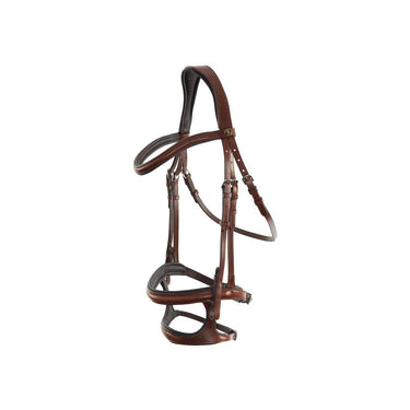 Dit symmetrische hoofdstel van hoogwaardig Europees leder heeft een E-Line kopstuk. Dit anatomisch gevormde kopstuk is zacht gevoerd en zorgt dankzij zijn ronde vorm voor extra vrijheid achter de oren van het paard. Het gebogen frondeel is zacht gevoerd en rond gebombeerd. De keelriem is aan beide zijden verstelbaar. De bakstukken zijn voorzien van blinde sluitingen. De dubbele neusriem combineert de werking van een hoge en een lage neusriem en is hierdoor geschikt voor sterke paarden. De afstand tussen de twee neusriemen is ongeveer 7 cm. De hoge neusriem (circa 3 cm breed) is rond gebombeerd, zacht gevoerd en voorzien van een zacht gevoerde kaakbeschermer. De lage neusriem is aan de voorkant gebombeerd en deels zacht gevoerd. Aan de achterkant ziet deze neusriem eruit als een sperriem. De gesp van deze riem is voorzien van een extra beschermflap. Het hoofdstel is uitgerust met glanzende, zilverkleurige fournituren van verchroomd messing. Exclusief teugels.