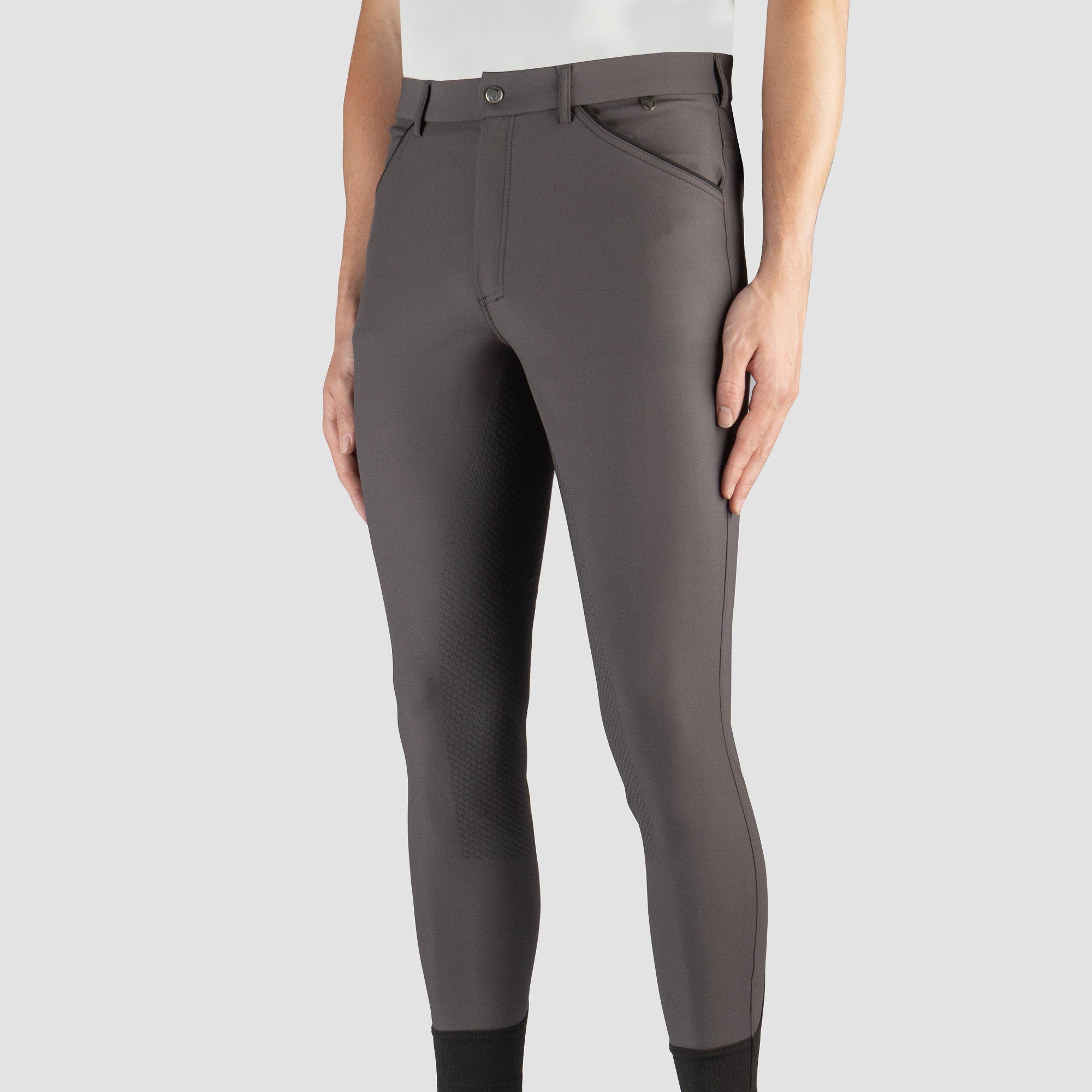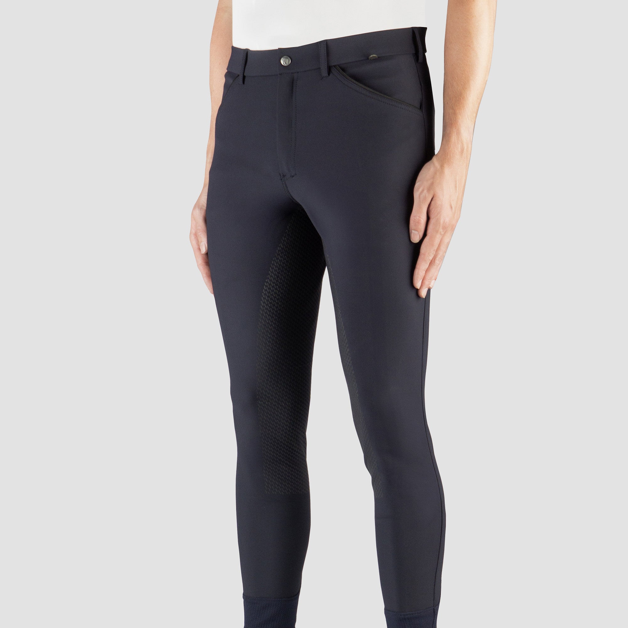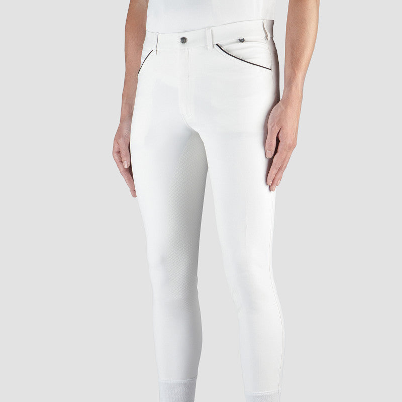 Exclusieve high end heren rijbroek van zeer technische stof met twee voor en achterzakken. Deze broek is voorzien van mesh enkelsokken en een mat siliconen zitvlak. Productspecificaties: Twee schuine voorzakken twee achterzakken met drukknopen Enkelsokken van mesh Contrasterende biezen op zakken Licht mat siliconen zitvlak Materiaal: 90% micro nylon 10% spandex
