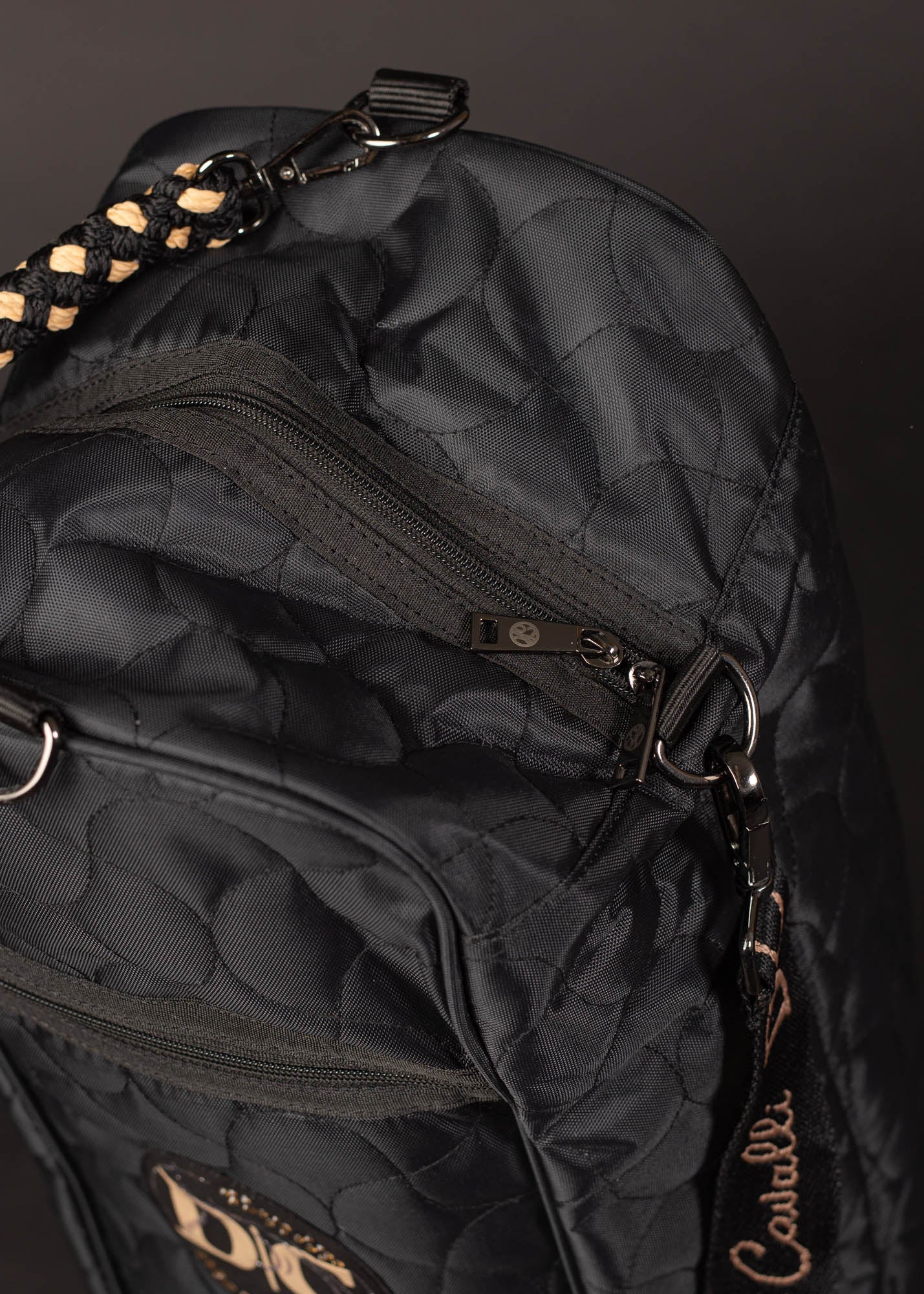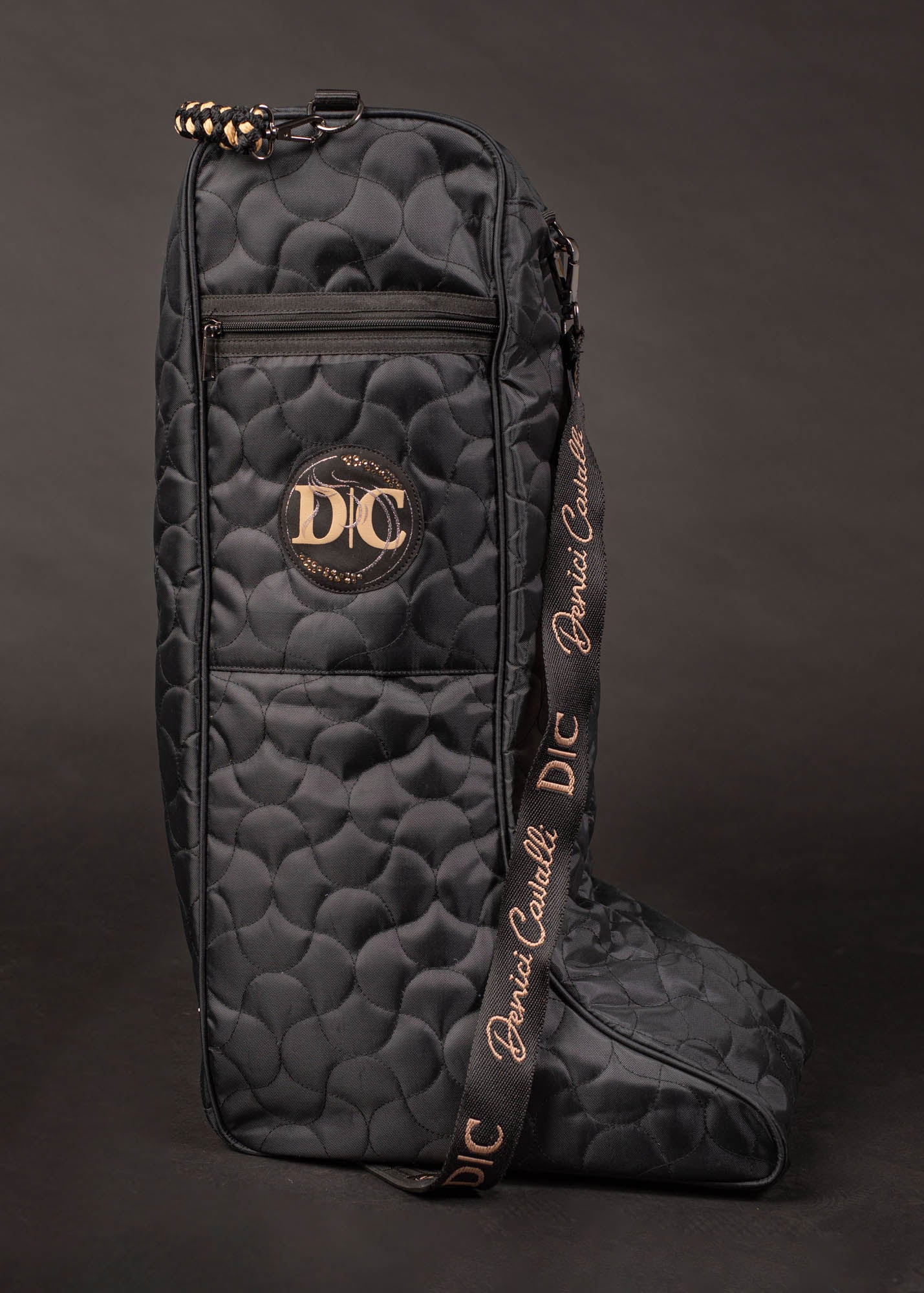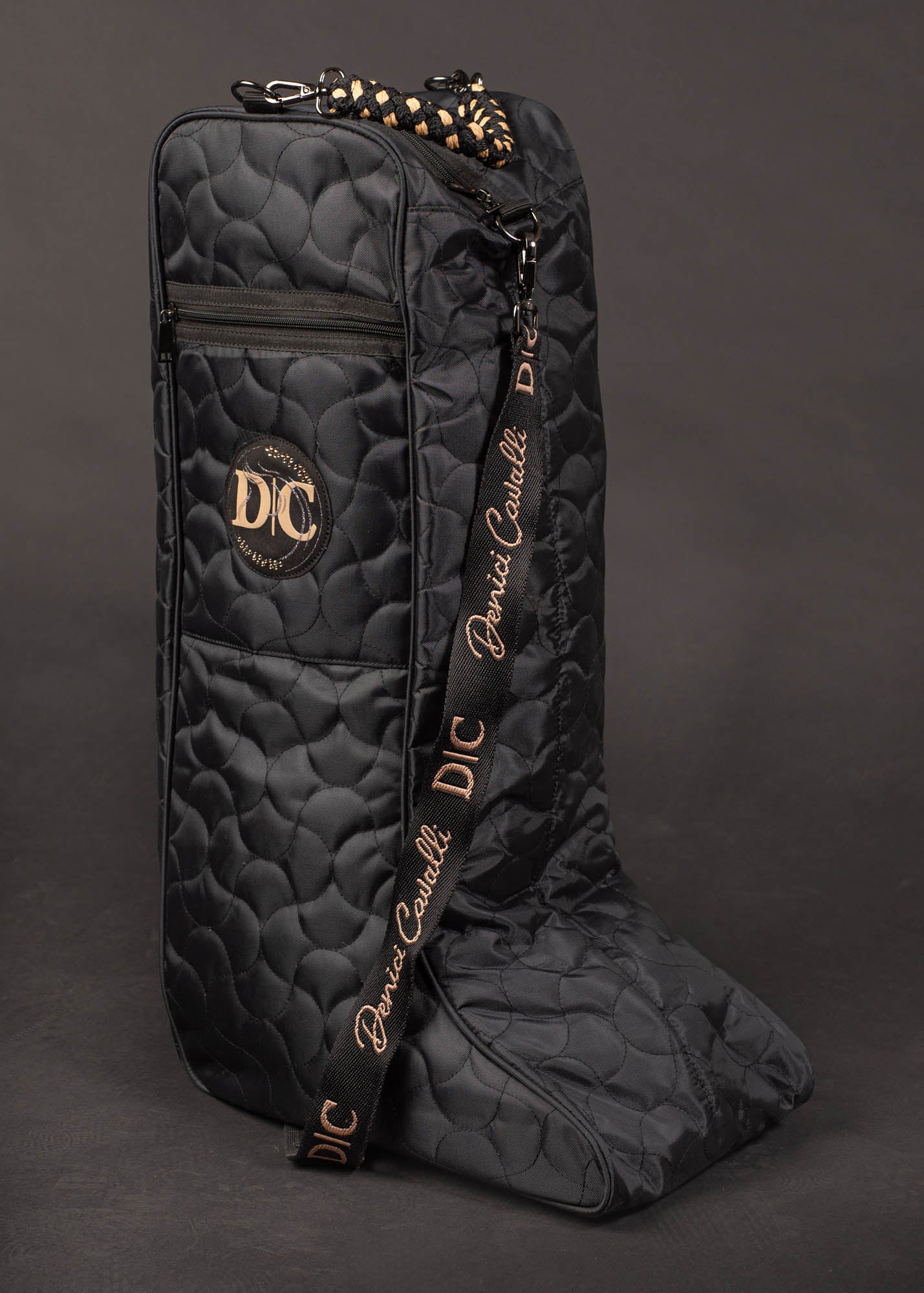 Laarzentas met allover quilt, Denici Cavalli logo met kristallen, een opbergvak met rits aan de buitenkant, comfortabel handvat in zwart/beige, verstelbare schouderband met het Denici Cavalli logo, stoffen tussenschot aan de binnenkant en kunststof noppen aan de onderkant.
