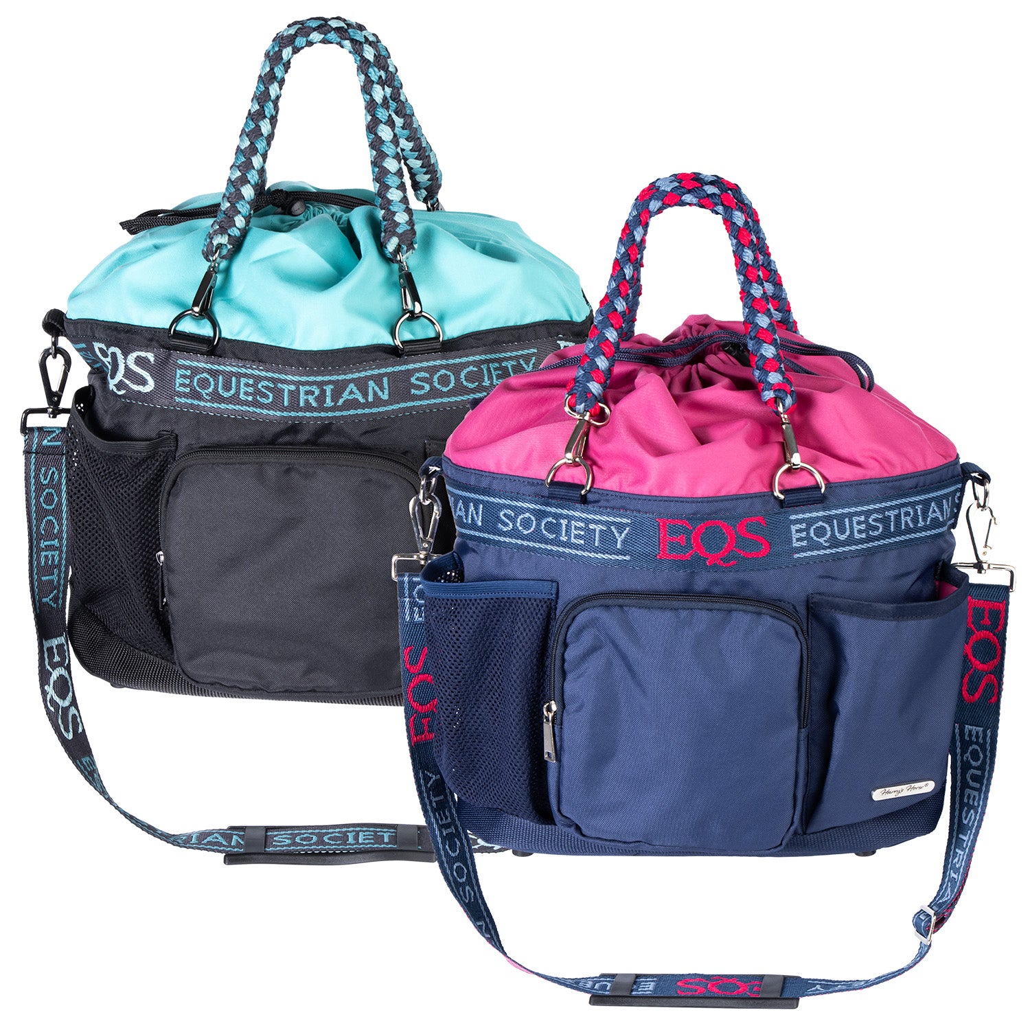 Sac de toilette avec sangles tout autour ornées du logo EQS, dessus contrastant avec fermeture à cordon multicolore, trois compartiments de rangement extérieurs, dont un avec fermeture éclair, poignées spéciales multicolores en forme de « corde de licol », bandoulière réglable avec logo EQS, boutons de protection en plastique au fond.
